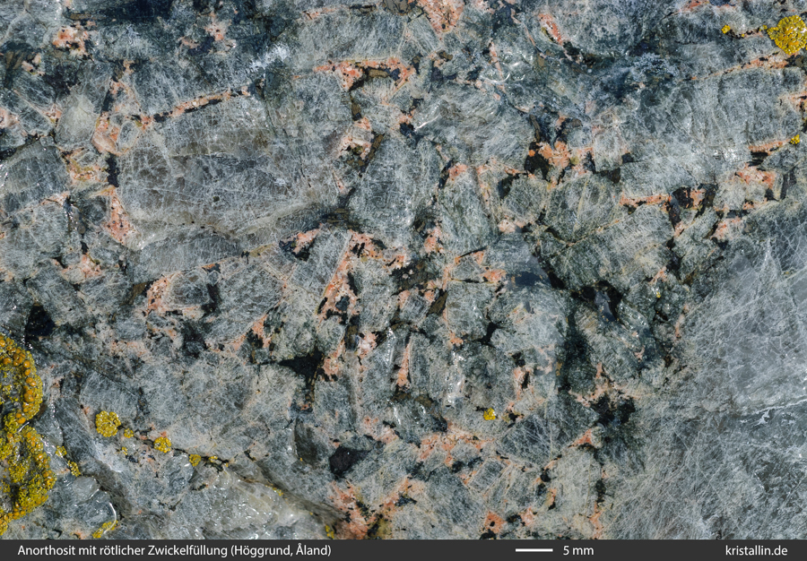 (22/28) Schöner grauer Anorthosit mit rötlicher Zwickelmasse.