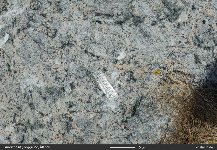 (23/28) An dieser Stelle ist der Anorthosit fast frei von Beimischungen. Die Plagioklaszwillinge im spiegelnden Kristall sind so groß, dass man sie im Stehen fotografieren könnte.