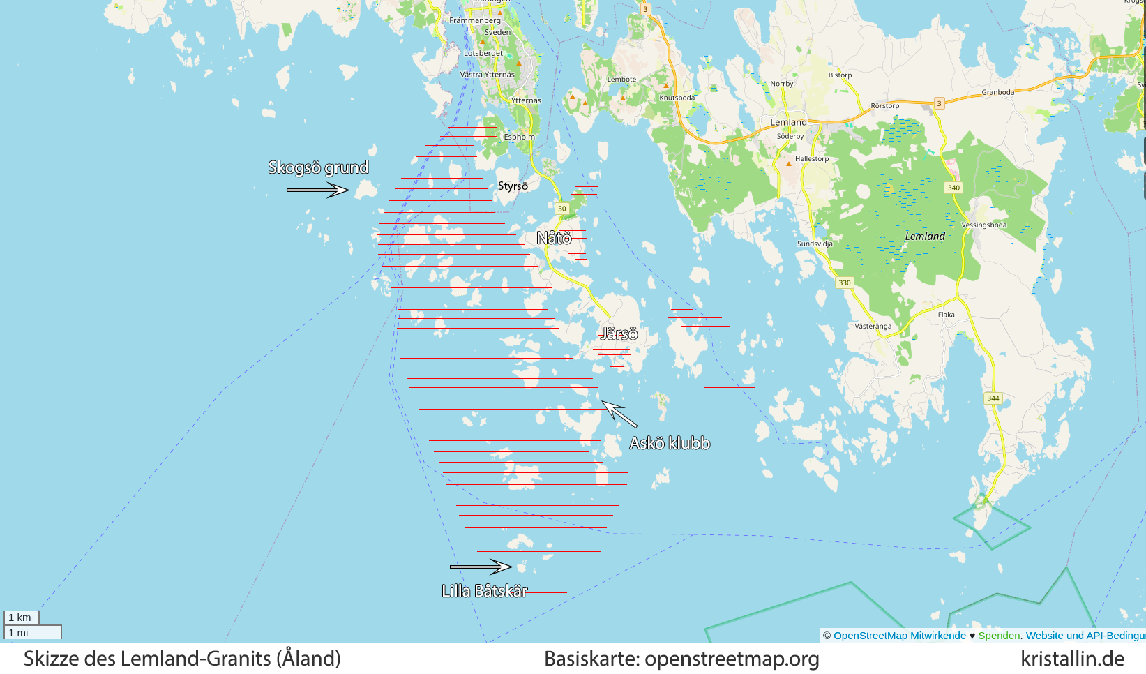 Der Lemland-Granit liegt im Süden der Ålandinseln, westlich der Insel Lemland. Dort steht das Gestein überwiegend unter Wasser an, ist aber auf kleinen Inseln zugänglich. Das Granitmassiv misst etwa 13 x 9 km, einschließlich eingeschlossener Nebengesteine. Die Schraffur in der Karte deutet die Größe und Lage des Plutons an.