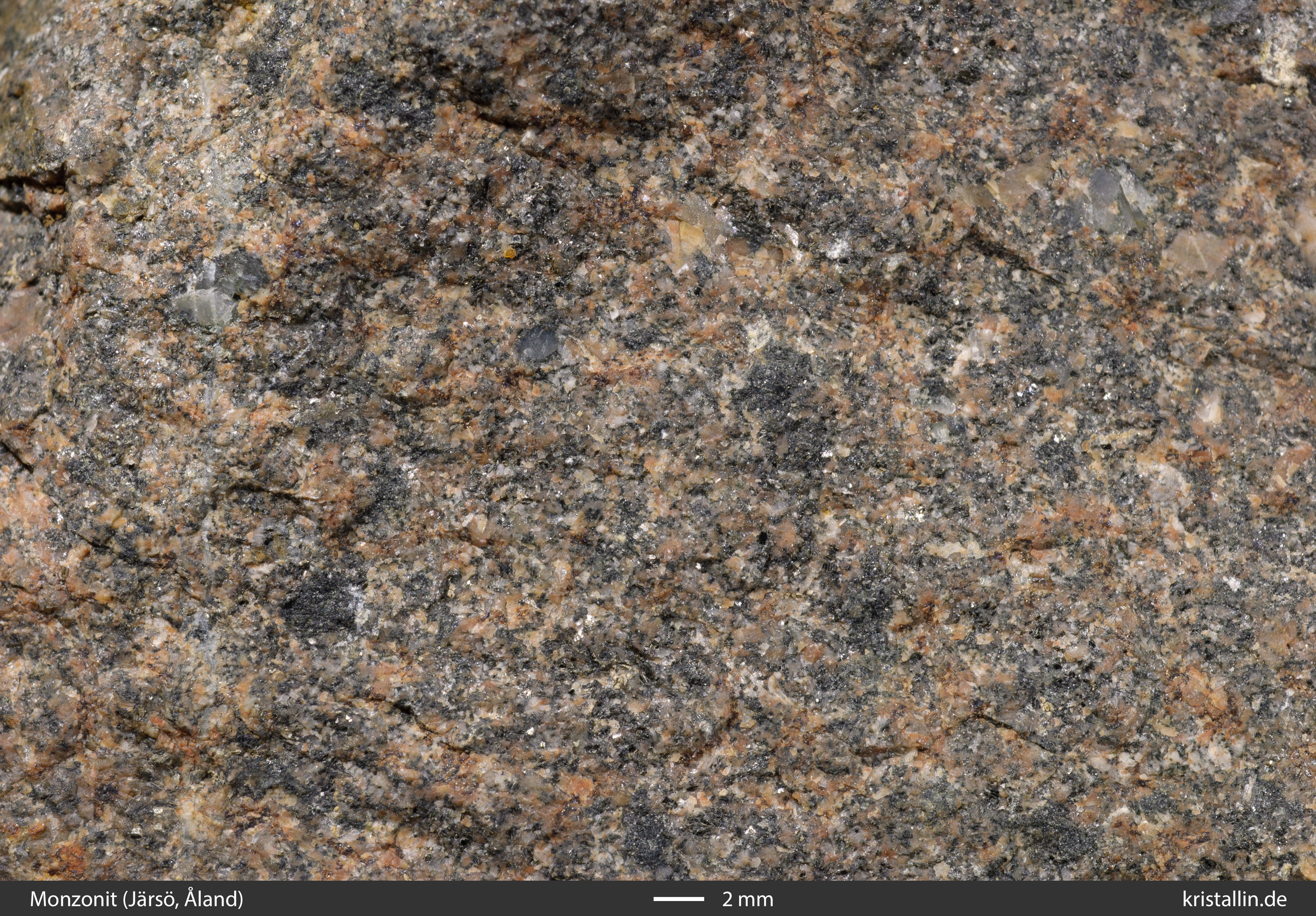 Dieses Gestein ist fein- bis mittelkörnig, braun oder graubraun. Besondere Eigenschaften sind makroskopisch nicht erkennbar. Da es ähnliche Gesteine mehrfach in Skandinavien gibt, ist dieser Monzonit ohne Labor nicht zu bestimmen. Für die Geschiebekunde spielt er keine Rolle.