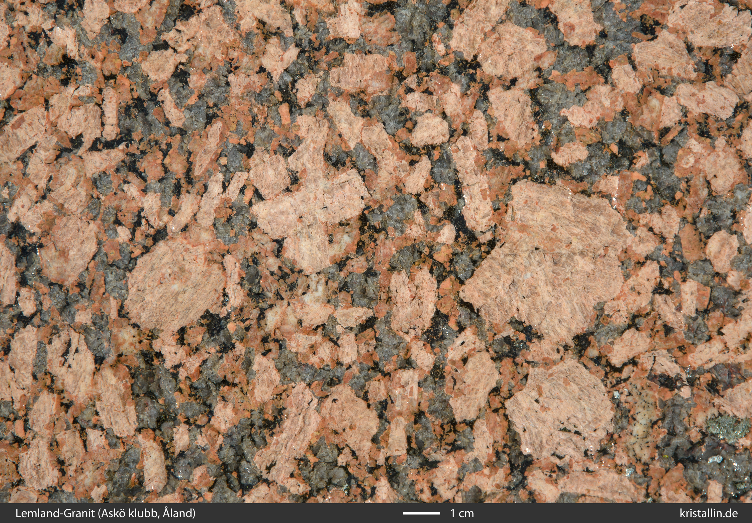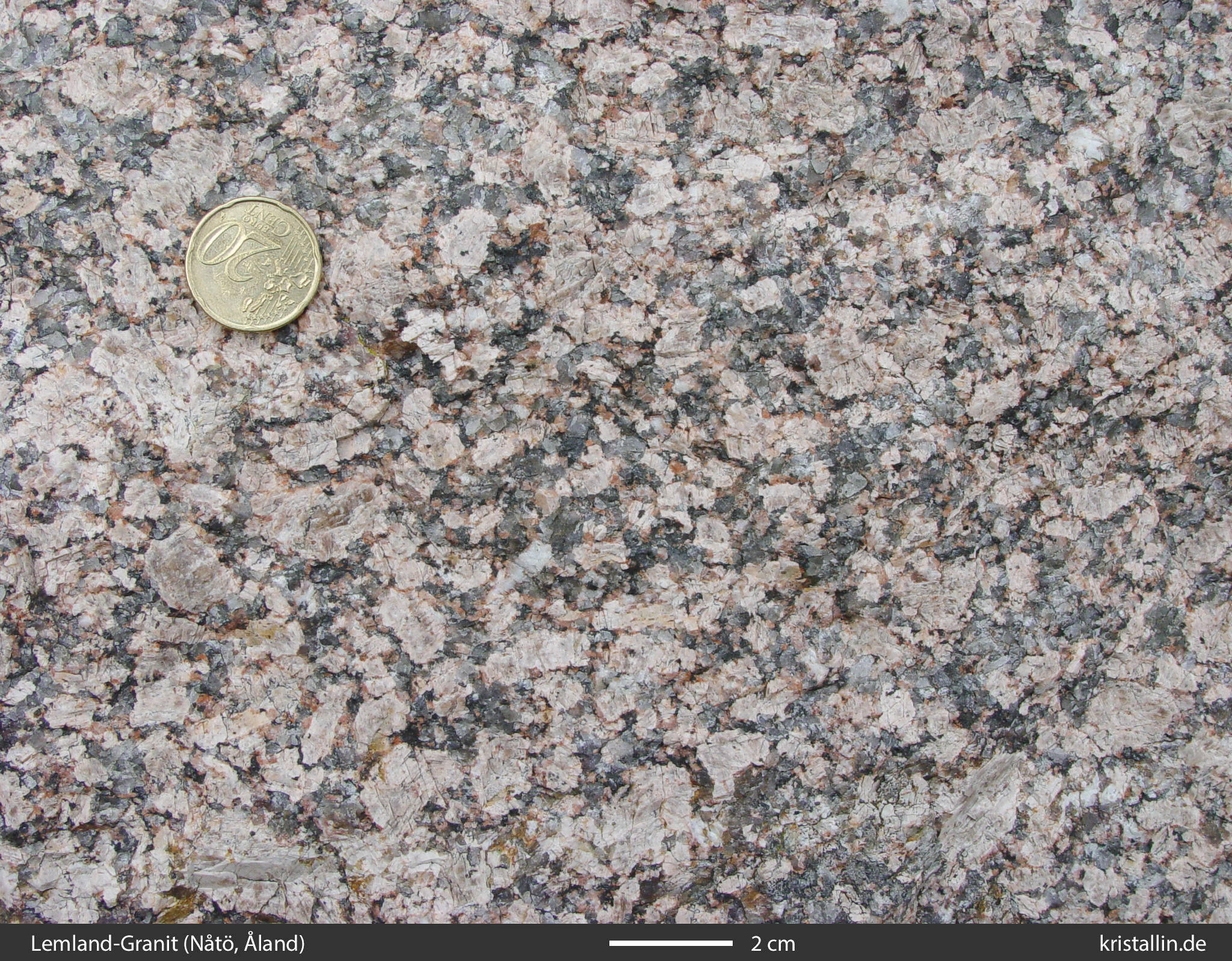 Die dunkelbraunen Plagioklase neben den hellen, länglich-rechteckigen Alkalifeldspäten sind typisch für diesen Granit. Wenn auch die Form der Quarze beachtet wird, ist der porphyrische Lemland-Granit ein leicht zu bestimmendes und verlässliches Leitgeschiebe für das südliche Åland.