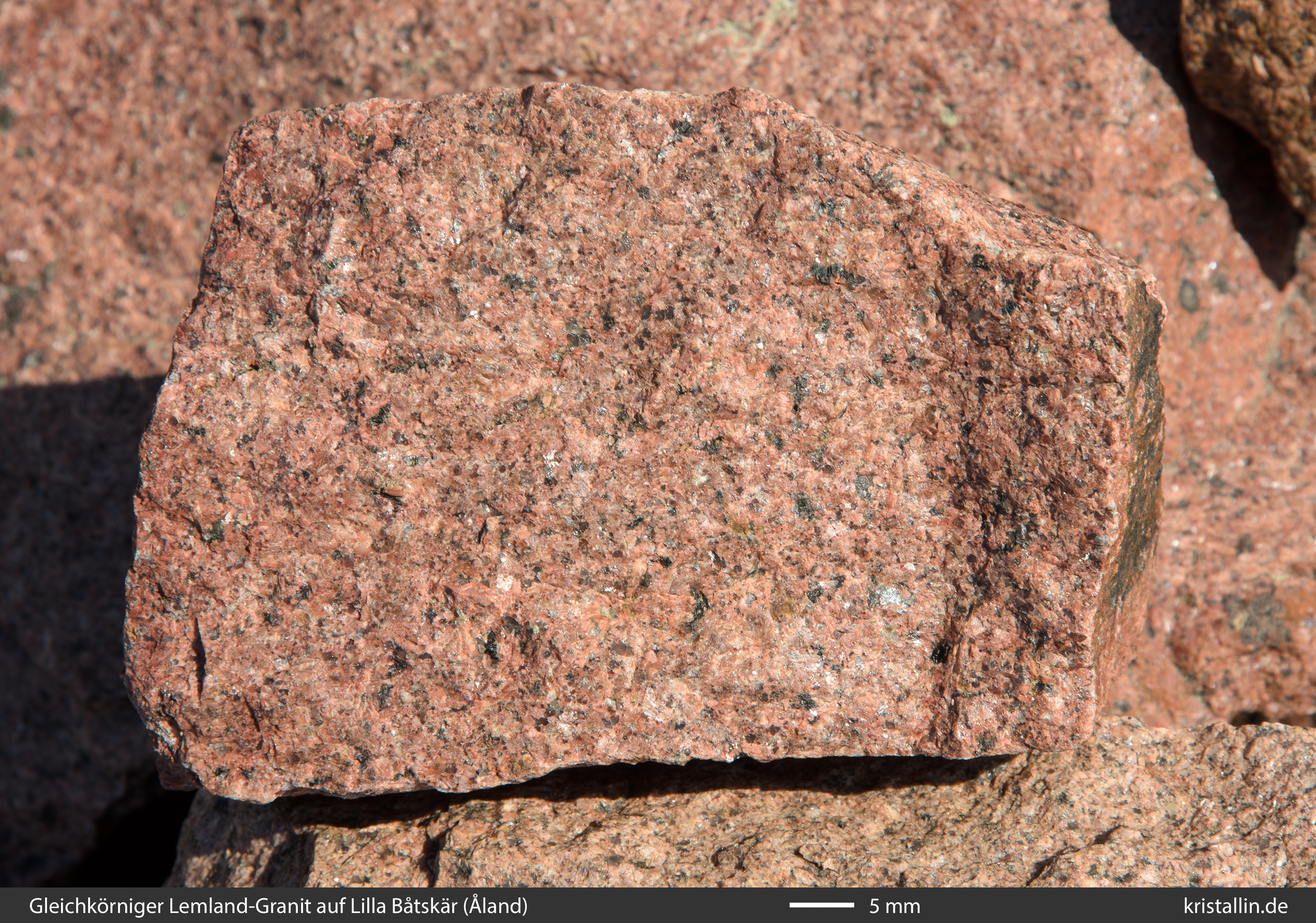 Auch der gleichkörnige Lemland-Granit ist kein Leitgeschiebe, denn er ist nicht von ähnlichen Gesteinen zu unterscheiden. Es ist bereits ambitioniert, bei so kleinem Korn die Feldspäte von Hand zu bestimmen. Das ist unverzichtbar, denn ein Geschiebefund mit gleichem Aussehen kann ja auch aus rotem Alkalifeldspat und blassem Plagioklas bestehen, was statistisch gesehen viel wahrscheinlicher ist. Dunkelbrauner Plagioklas ist generell selten.