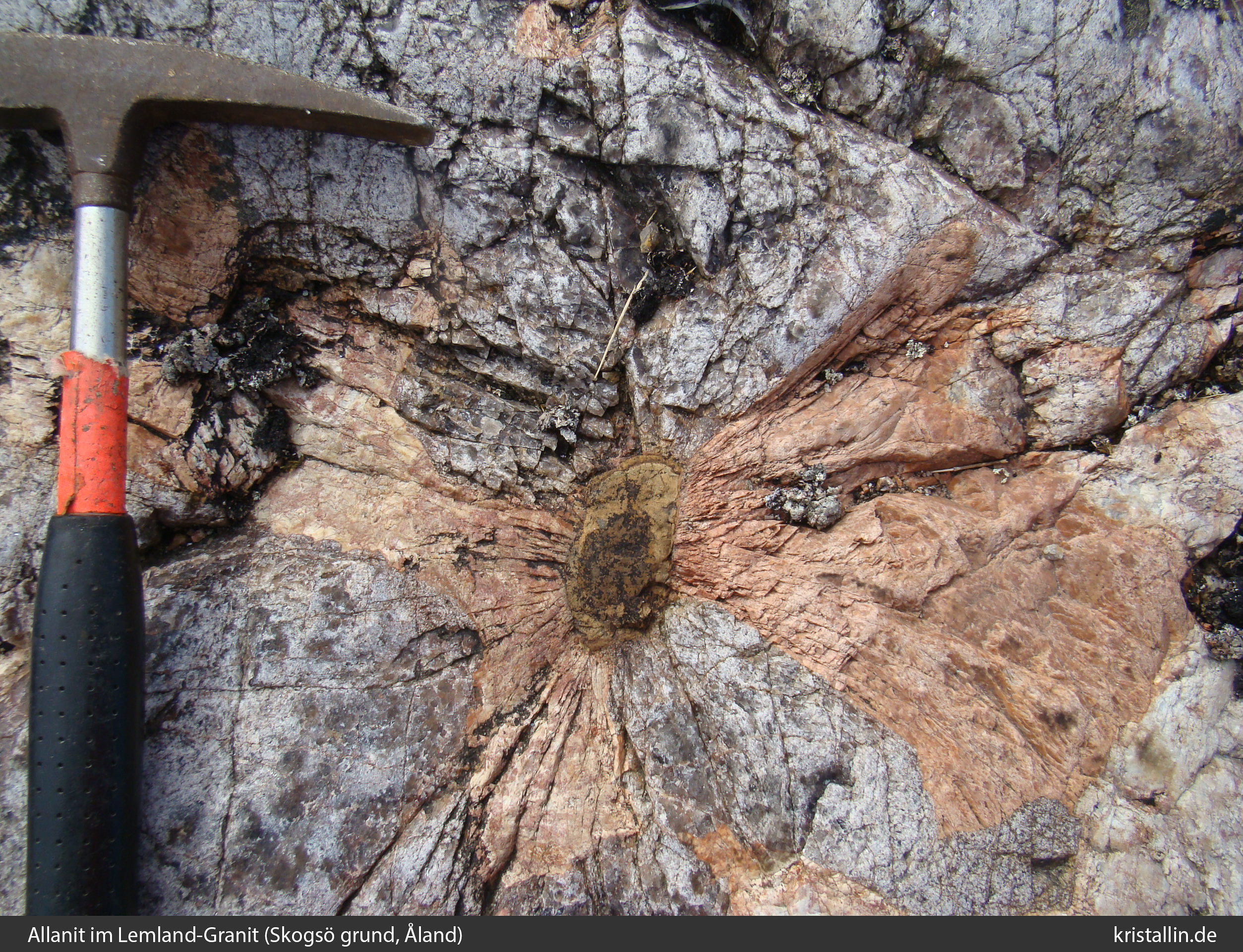 Das Besondere ist, dass bei diesem Zerfall das Volumen zunimmt und der anschwellende Allanit einen so großen Druck auf das Umgebungsgestein ausübt, dass sich radialstrahlige Risse bilden. (Der Hammer ist 33 cm lang.)