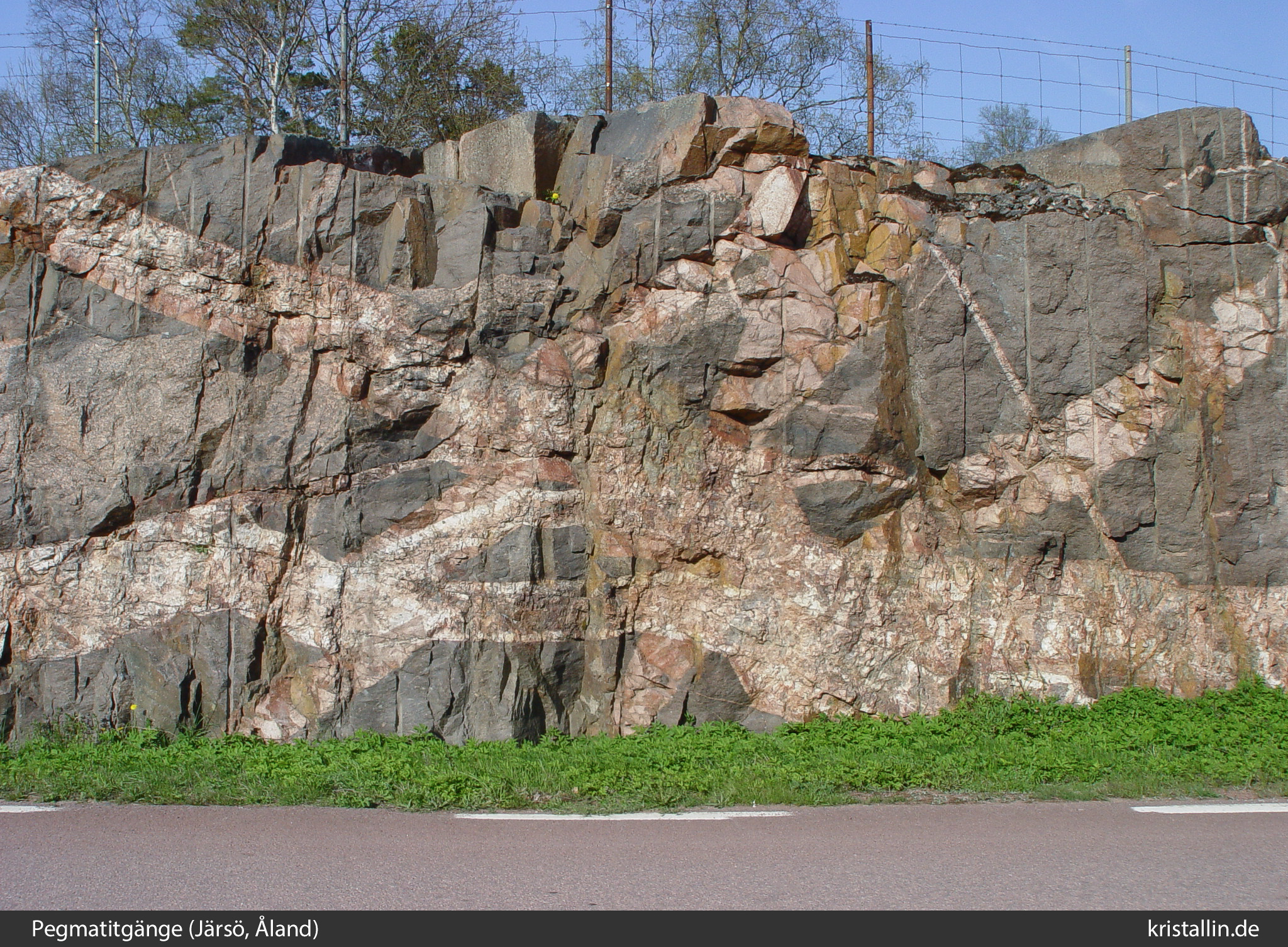 Auf Järsö gibt es einen großen Straßenaufschluss, in dem sich Pegmatitgänge unterschiedlichen Alters durchkreuzen. Sie alle stecken im Monzonit.