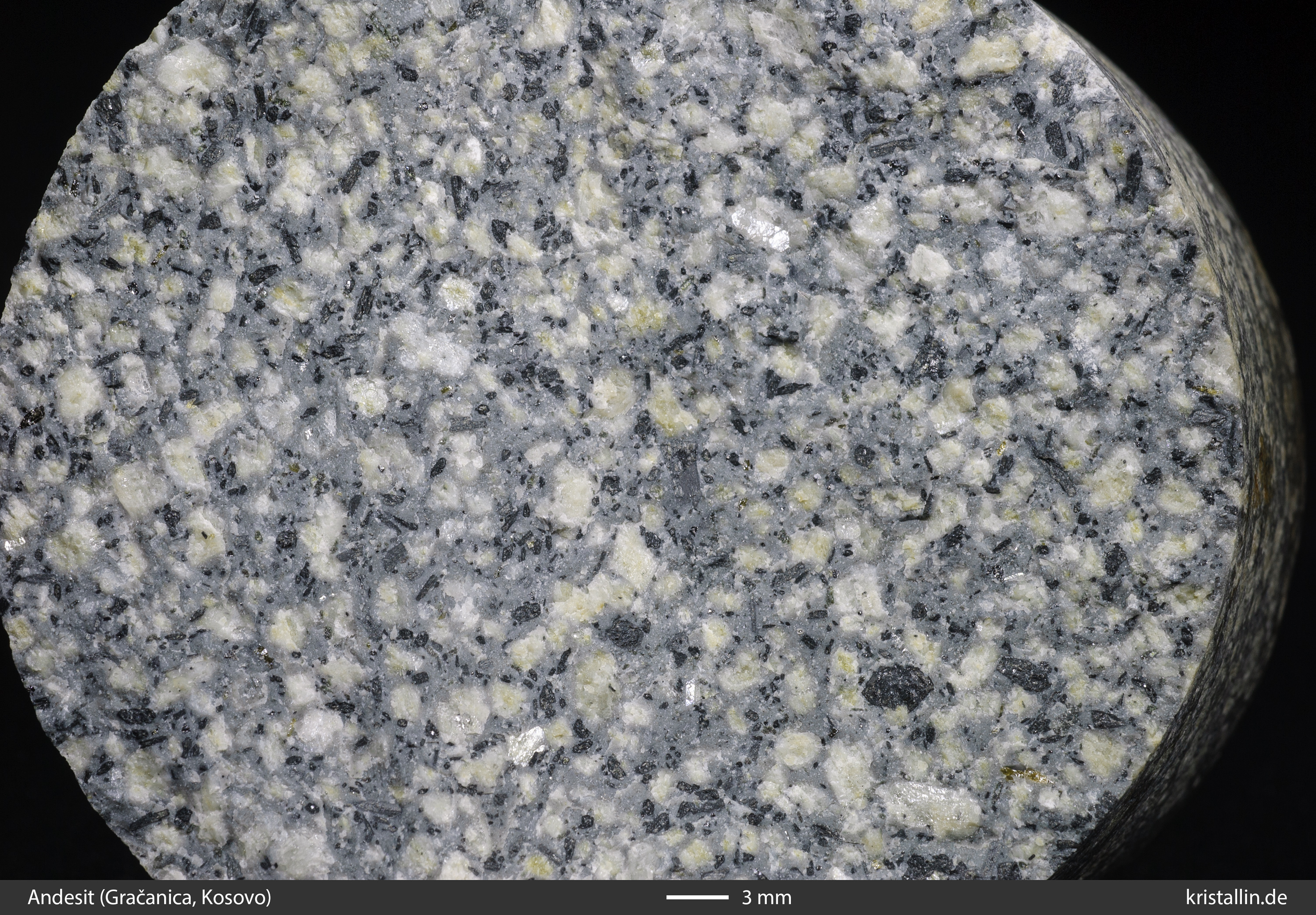 In Europa kommen Andesite nur auf kleiner Fläche vor. Der folgende stammt aus dem Kosovo und enthält besonders viele Einsprenglinge. Die Probe ist ein Bohrkern aus der Nähe von Gračanica.