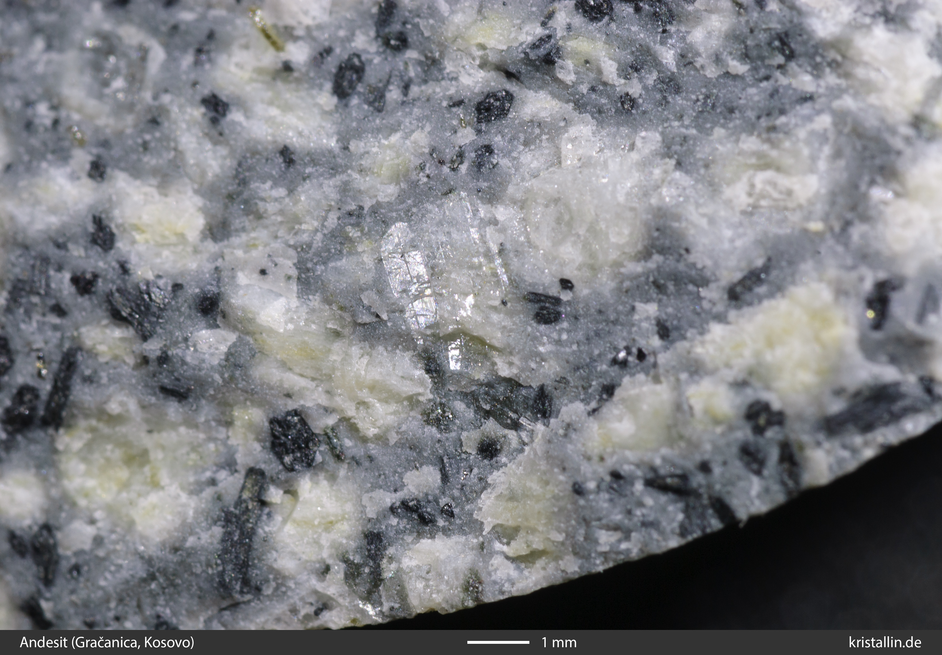 Die hellen Einsprenglinge hier sind Plagioklase, die dunklen Kristalle sehr wahrscheinlich Amphibole. (Für eine genaue Aussage müsste das Stück zerschnitten werden.)