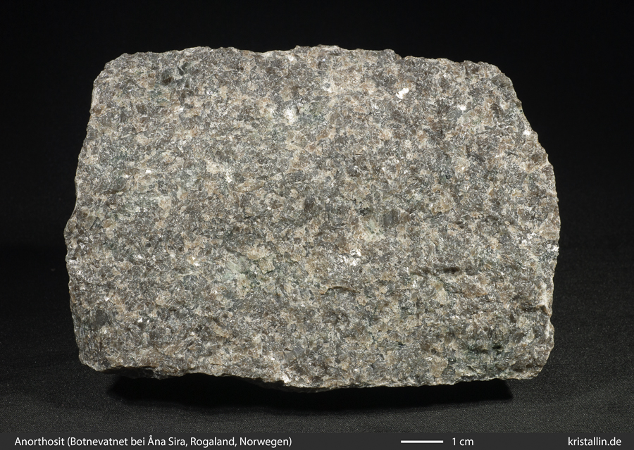 (1/47) Ein typischer Anorthosit sieht im Handstück wenig aufregend aus. Auffällig ist allein, dass das Gestein aus nur einem Mineral besteht. Wenn man die Probe bewegt, glitzert es überall. Das bedeutet, dass das Mineral Spaltbarkeit hat, also wohl ein Feldspat sein wird. (Denn es ist ganz offensichtlich kein dunkles Mineral und auch kein Glimmer, was die anderen Kandidaten für Minerale mit Spaltbarkeit wären.*) Damit lautet die nächste Frage: welcher Feldspat?