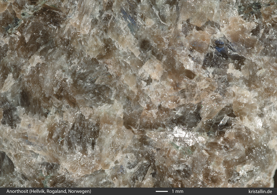 (5/47) Aus der Nähe: Ein grobkörniger Anorthosit aus dem Rogaland in Norwegen. Beide Spaltflächen zeigen die polysynthetischen Verzwillingungen.