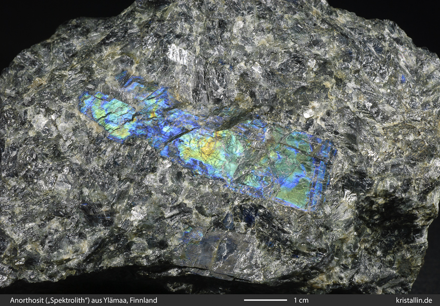(30/47) Noch ein schöner Spektrolith. Der Feldspatkristall ist fast 5 cm lang.