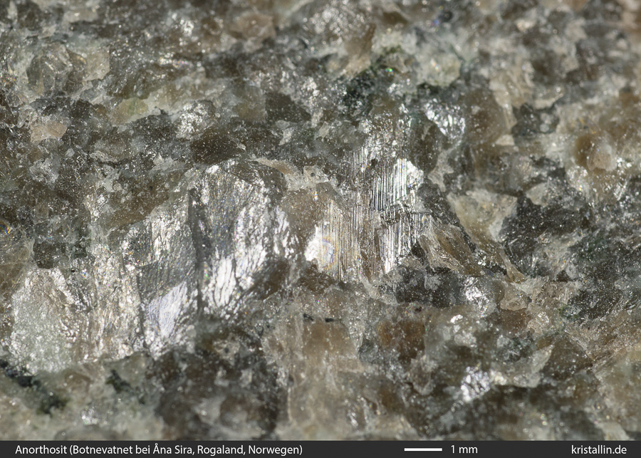 (2/47) The cleavage surfaces are examined with a magnifying glass. If the rock is not heavily weathered, the twin stripes characteristic of plagioclase can be found. Here just to the right of the middle, reflecting. (Please enlarge the picture.)