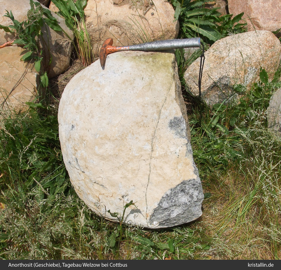 (38/47) This is what an anorthosite erratic can look like if it has been outside for a long time. The light weathering crust was so thick that the stone could not be determined without a fresh surface.