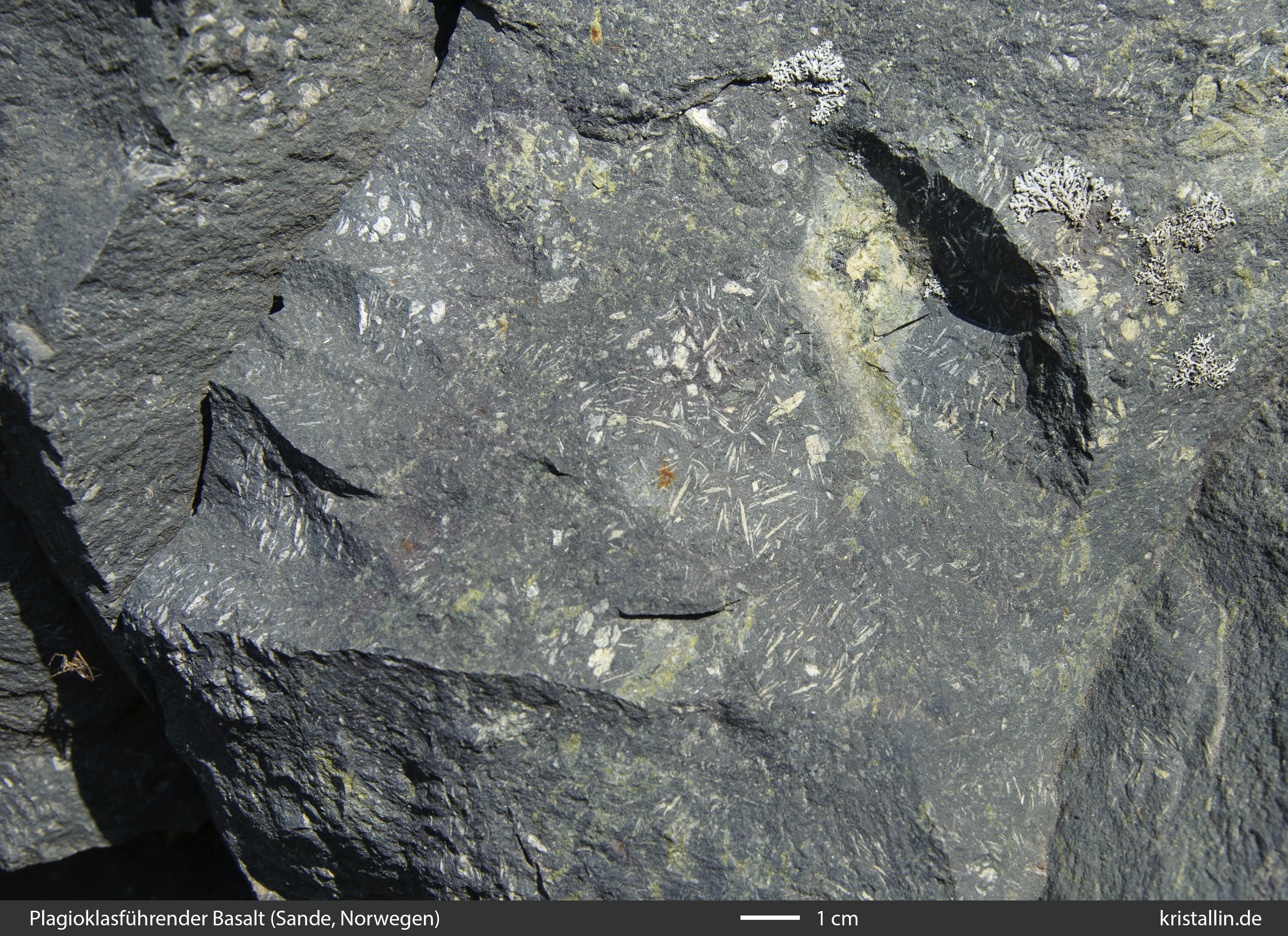 Basalte werden für Amateure bestimmbar, wenn sie Einsprenglinge von Plagioklas enthalten. Einsprenglinge sind Feldspatkristalle, die schon vor dem Erstarren der Schmelze gebildet wurden. So ein Gestein kann man „plagioklasführenden Basalt“ nennen.