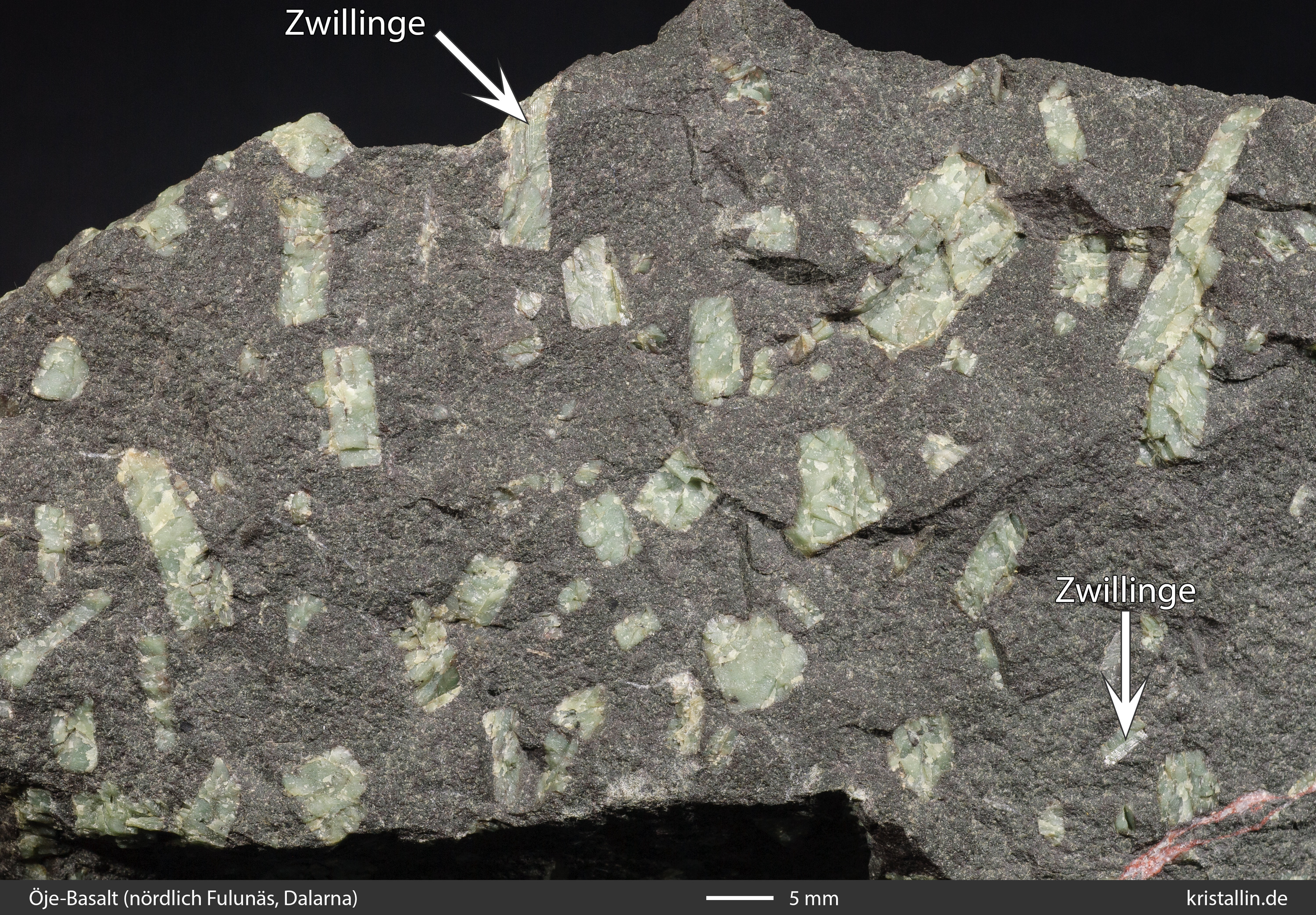 Findet man in den Einsprenglingen keine Zwillinge, bleibt noch die Vergrünung der Feldspäte bzw. des gesamten Gesteins als Hinweis auf eine basaltische Zusammensetzung.