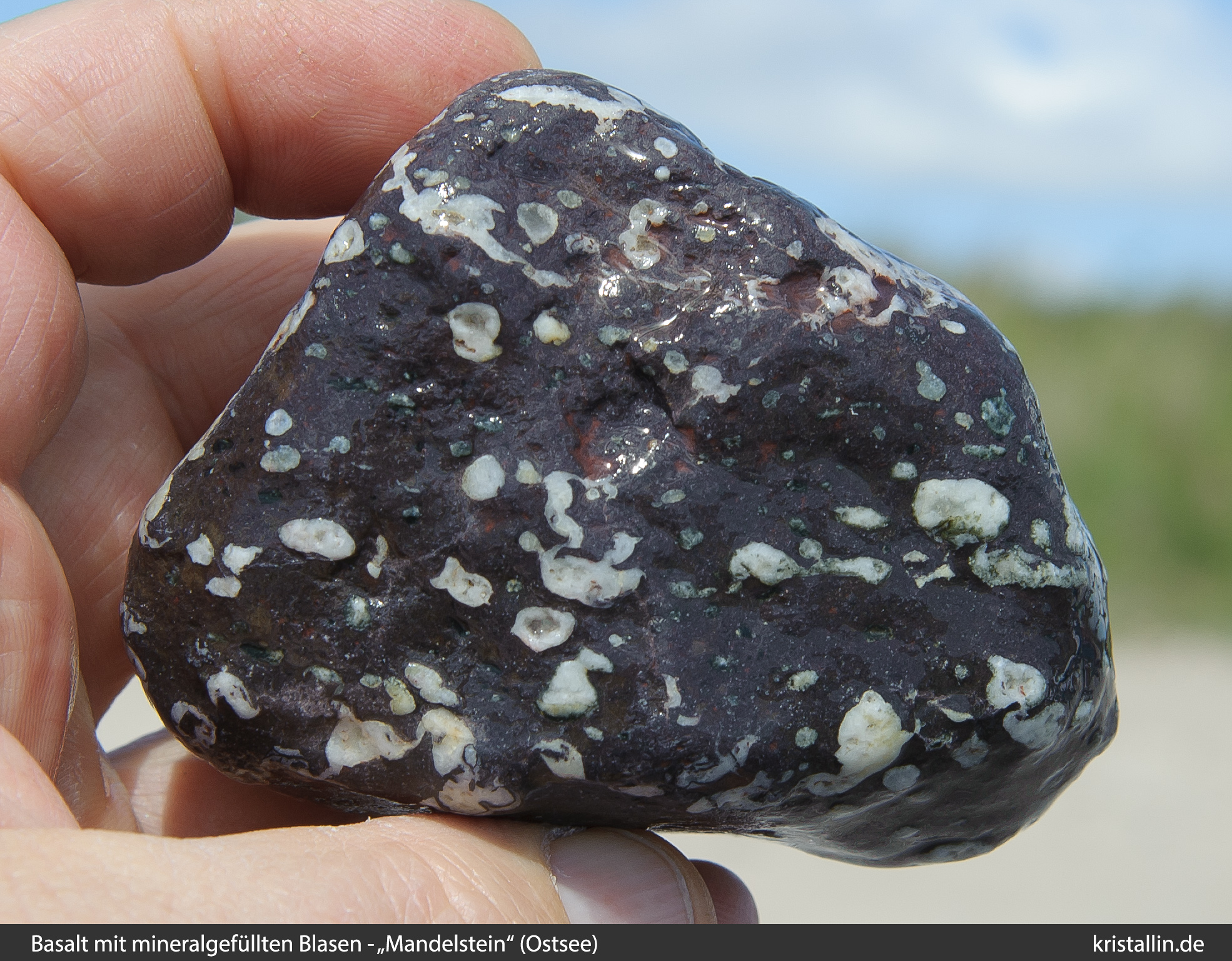 In frischen Basalten sind solche Blasen offen. Sie können sich nachträglich füllen, wenn Wasser durch das Gestein sickert und Kalzit, Quarz und auch intensiv grünen Epidot abscheidet. Diese Minerale stammen aus dem Basalt selbst und entstehen bei der Zersetzung von Plagioklas und Pyroxen. Basalte mit gefüllten Blasen werden auch „Mandelstein“ genannt.