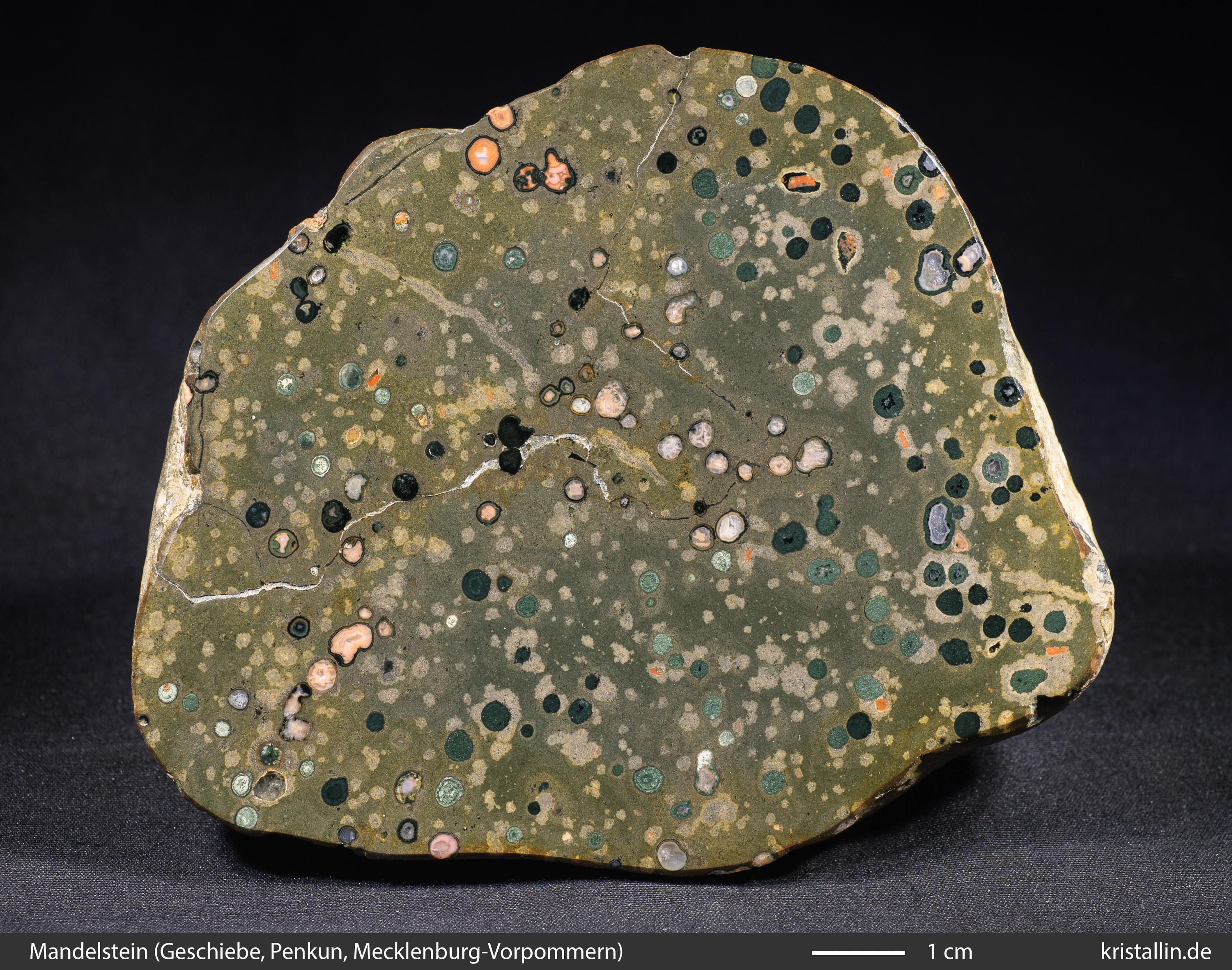 Neben Achat gibt es hier auch grünlich, weiß und schwarz gefüllte Blasen. Die Minerale darin sind von Hand nicht bestimmbar, dafür braucht man einen Gesteinsdünnschliff, ein spezielles Mikroskop und viel Erfahrung.