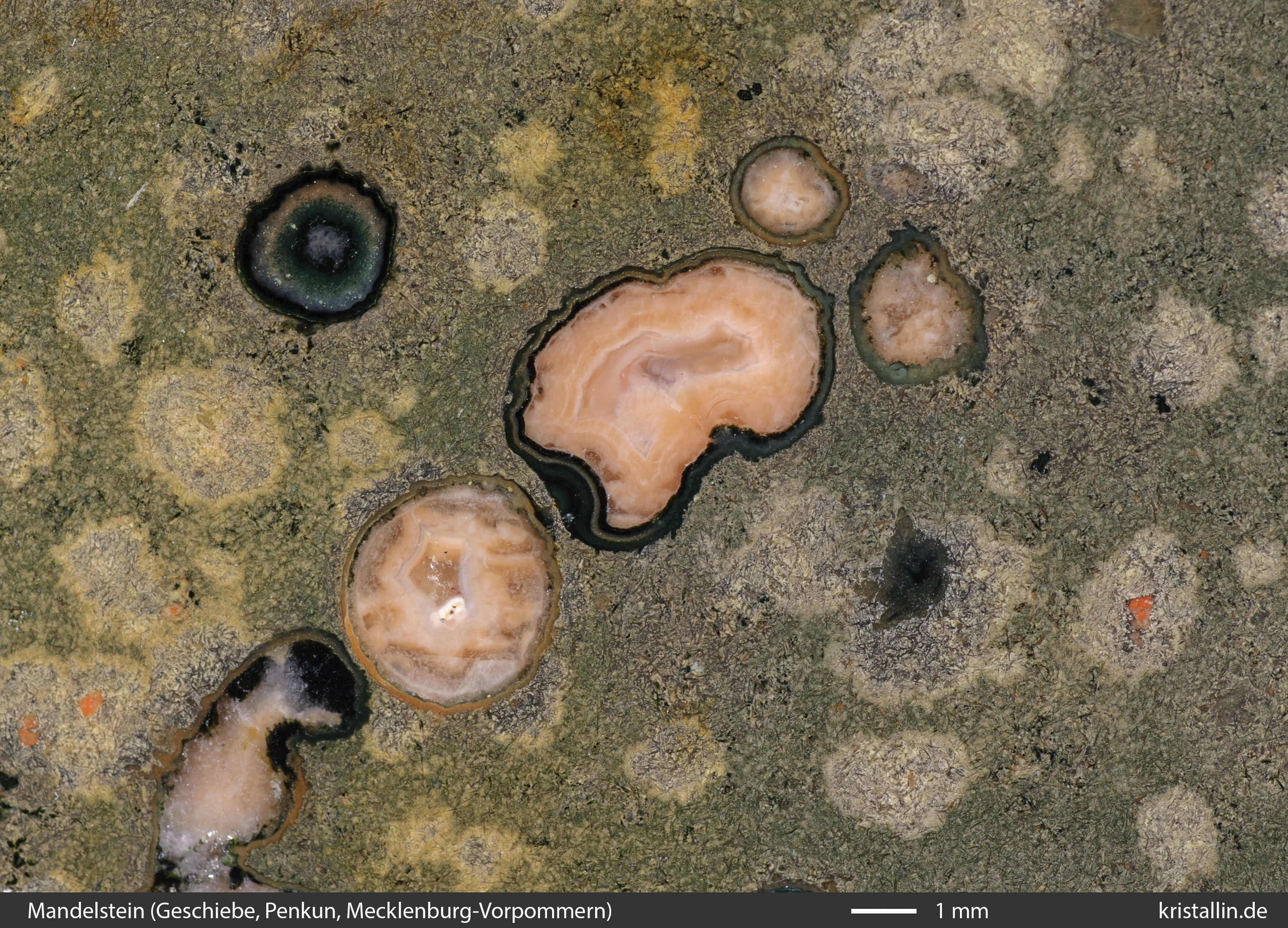 Manche Blasen sind mit Achat gefüllt. Das kann hübsch aussehen, vor allem auf polierten Flächen. Die folgende Probe hat gleichzeitig auch eine vergrünte Grundmasse.