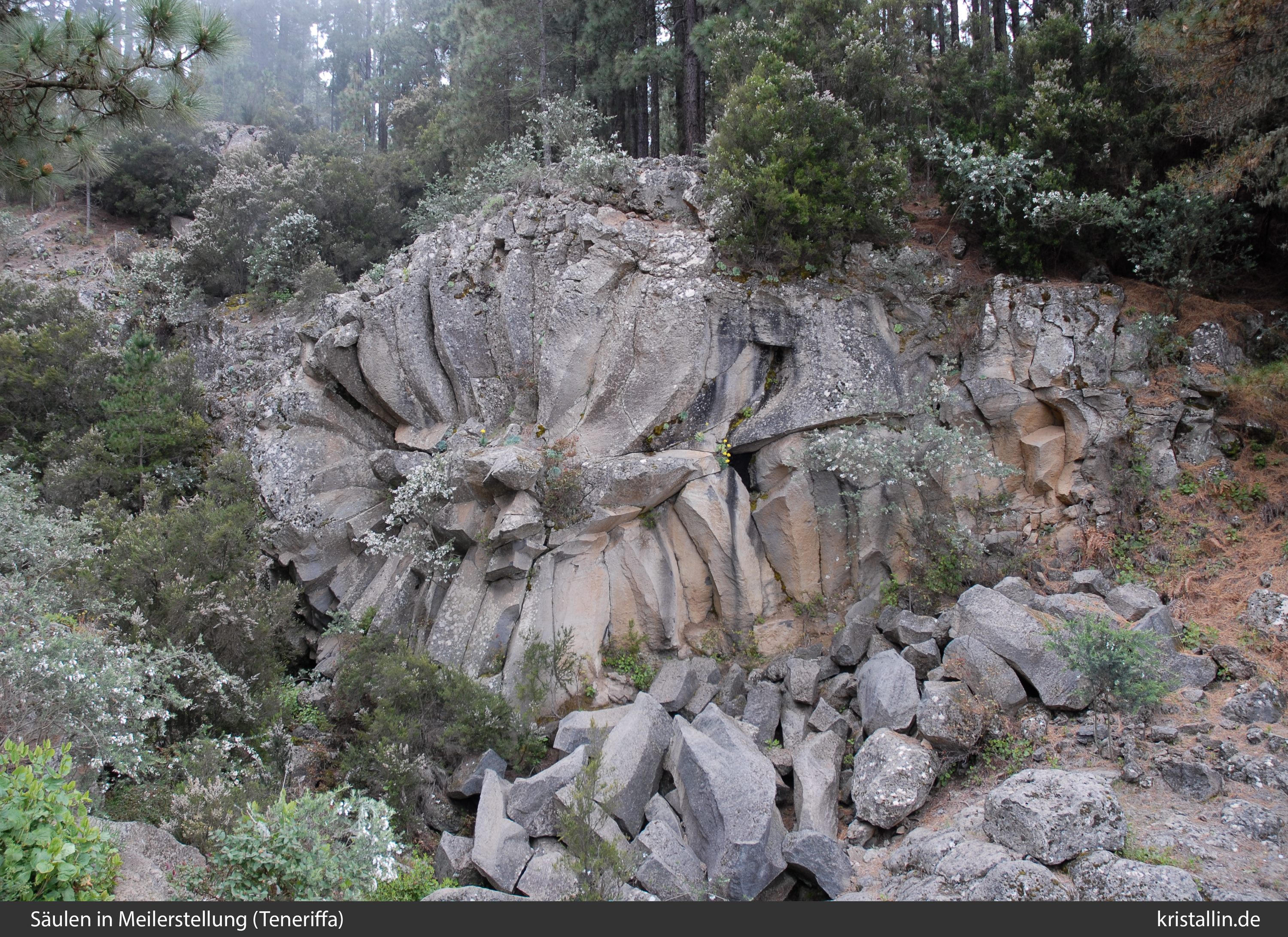 Wenn Schmelze in ein ringsum kaltes Nebengestein eindringt, zeigen die Säulen in alle Richtungen nach außen. So etwas nennt man „Meilerstellung“ oder kurz „Meiler“, nach dem Meiler der Köhler.