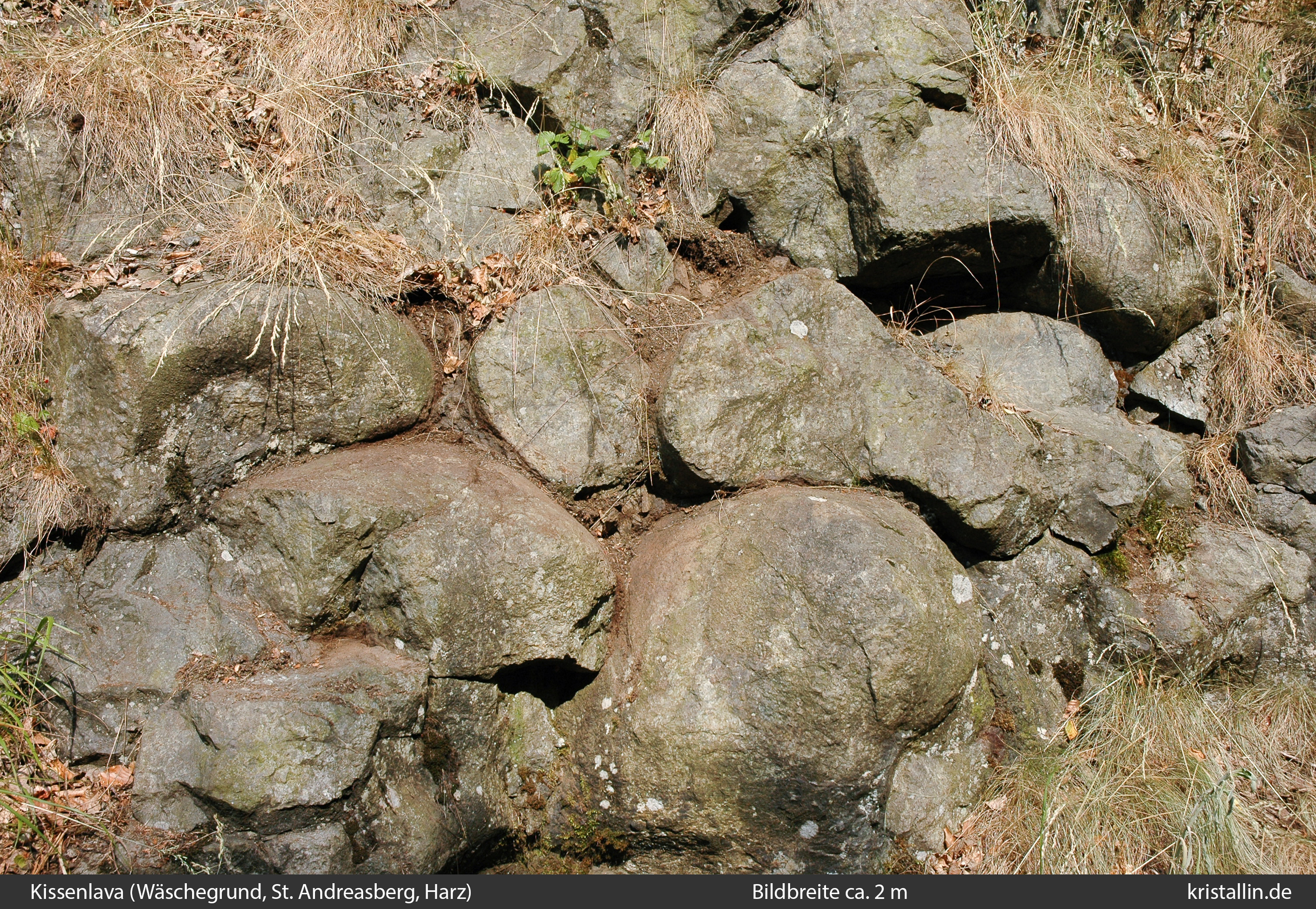 Diese schlauchartigen „Kissen“ lagern sich auch übereinander ab und zeigen dann im Anschnitt das charakteristische Bild der Kissenlava: viele rundliche Gebilde aus Basalt, die zwischen etwa 30 cm und ungefähr einem Meter groß sind.