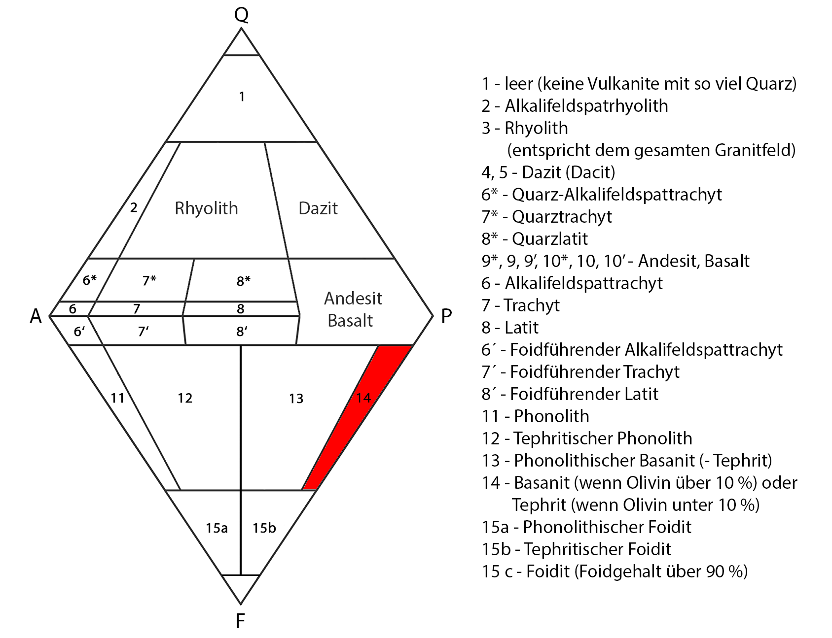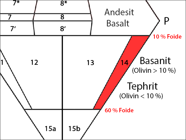 Basanite und Tephrite stehen im Streckeisen-Diagramm der Vulkanite im Feld 14.