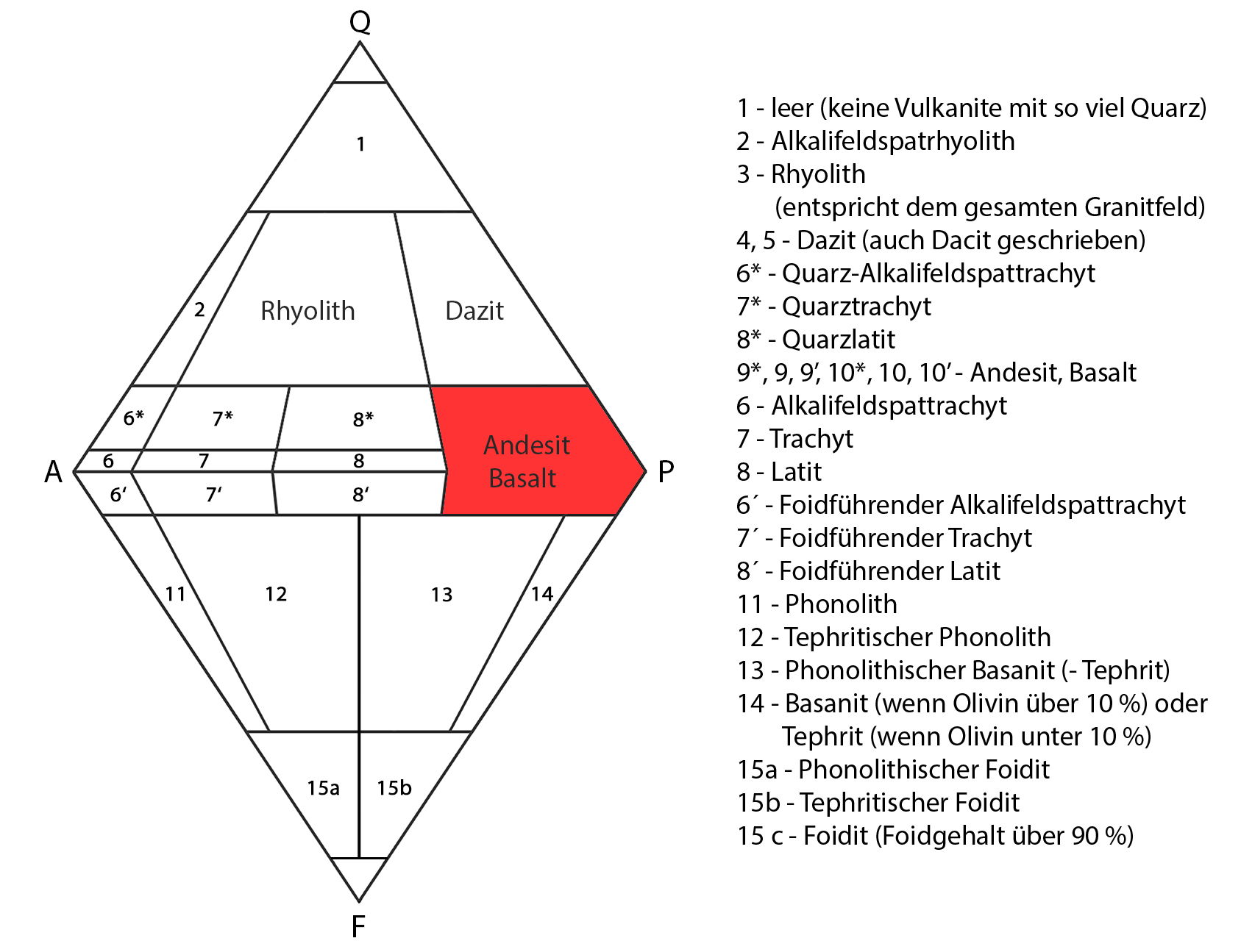 Im QAPF-Diagramm steht Basalt im Feld 10. Neben Plagioklas kann er bis zu 20 % Quarz oder bis zu 10 % Foide enthalten - unsichtbar in der Grundmasse. Dazu kommt der Kalziumgehalt im Plagioklas, von dem die Unterscheidung in Basalt oder Andesit abhängt. Ist der Kalziumgehalt hoch, ist das Gestein ein Basalt. Ist er niedrig, ist es ein Andesit. Um das festzustellen, braucht man ein Labor. Im Handstück ist das nicht zu erkennen (Vinx 2015, S. 235).