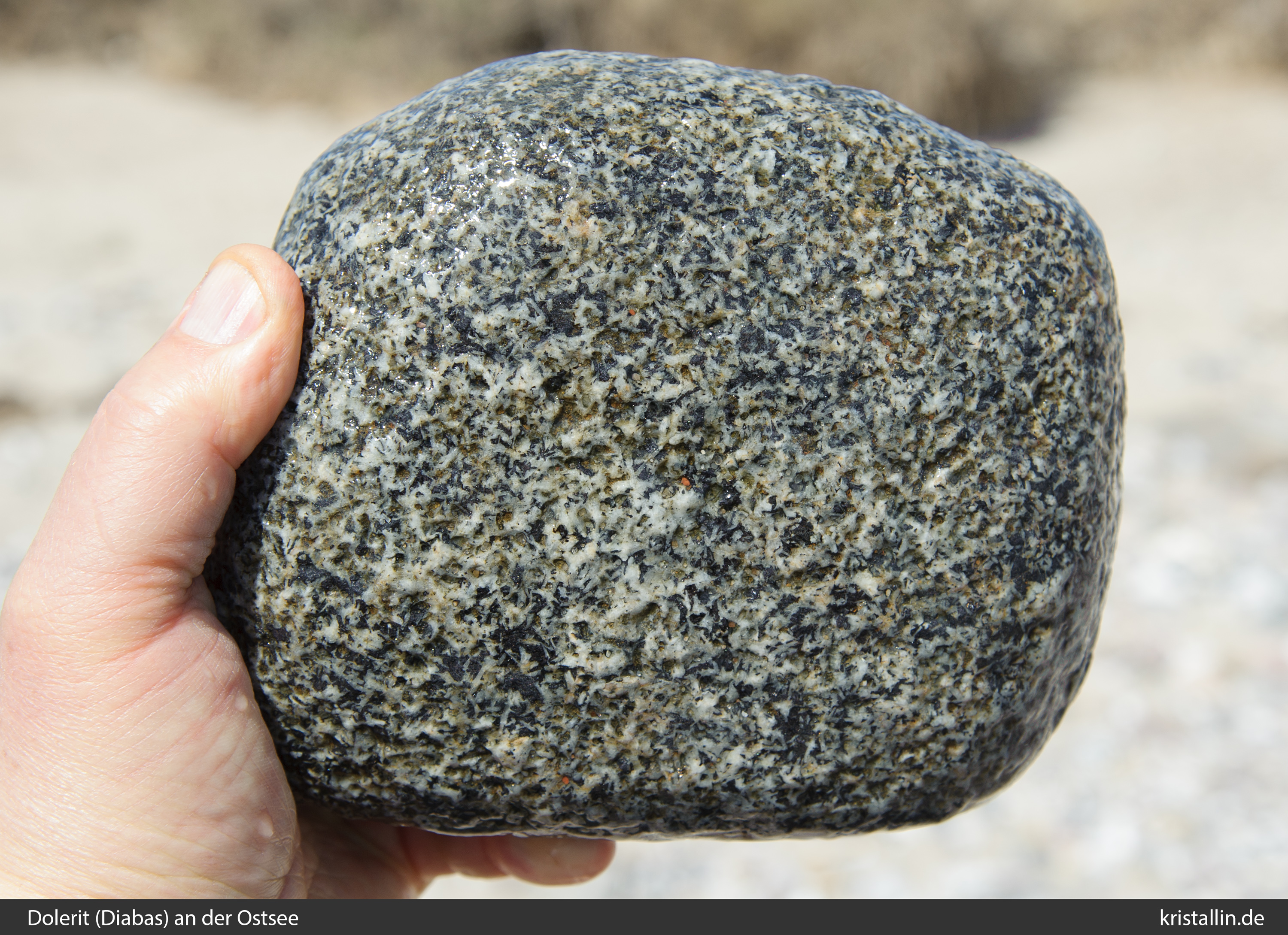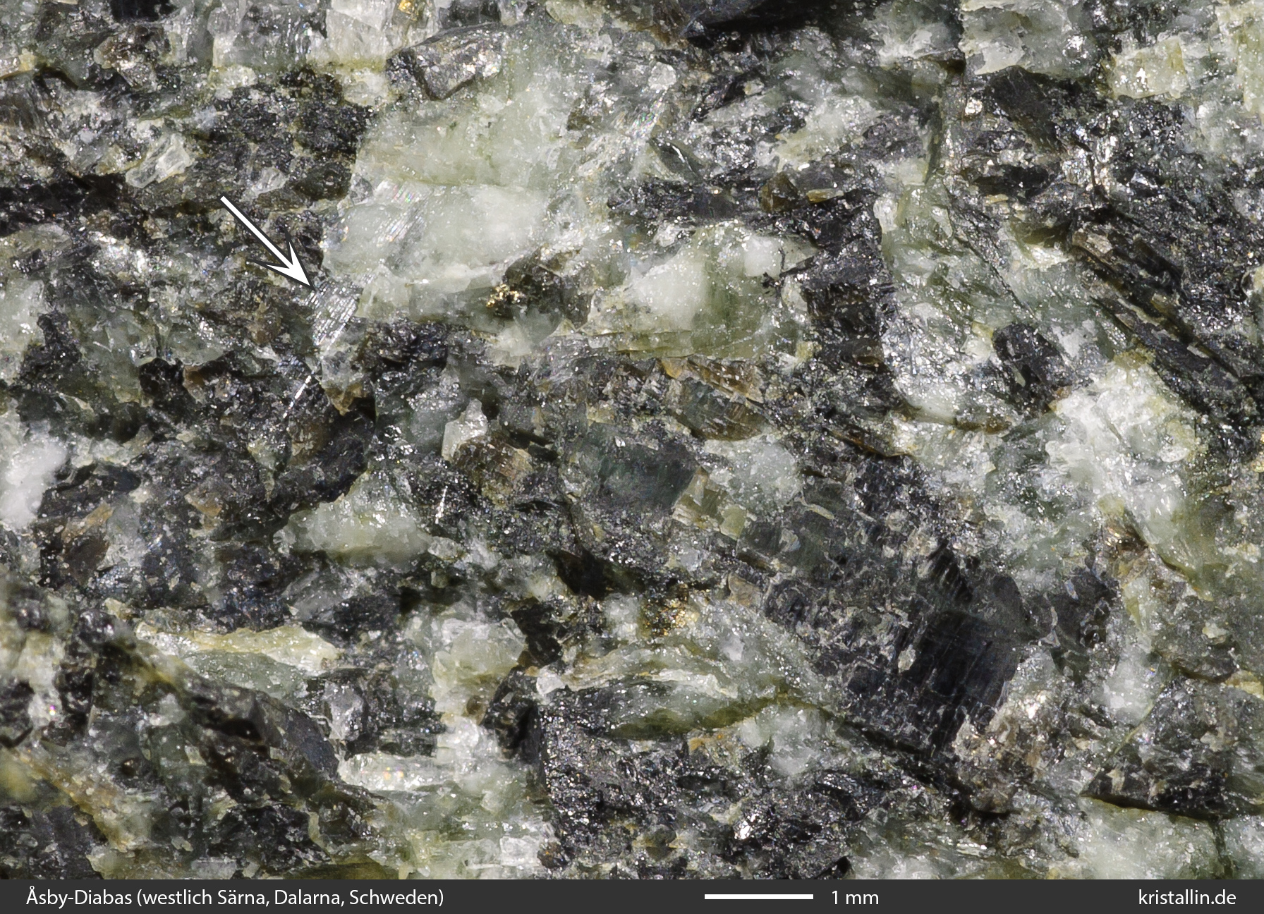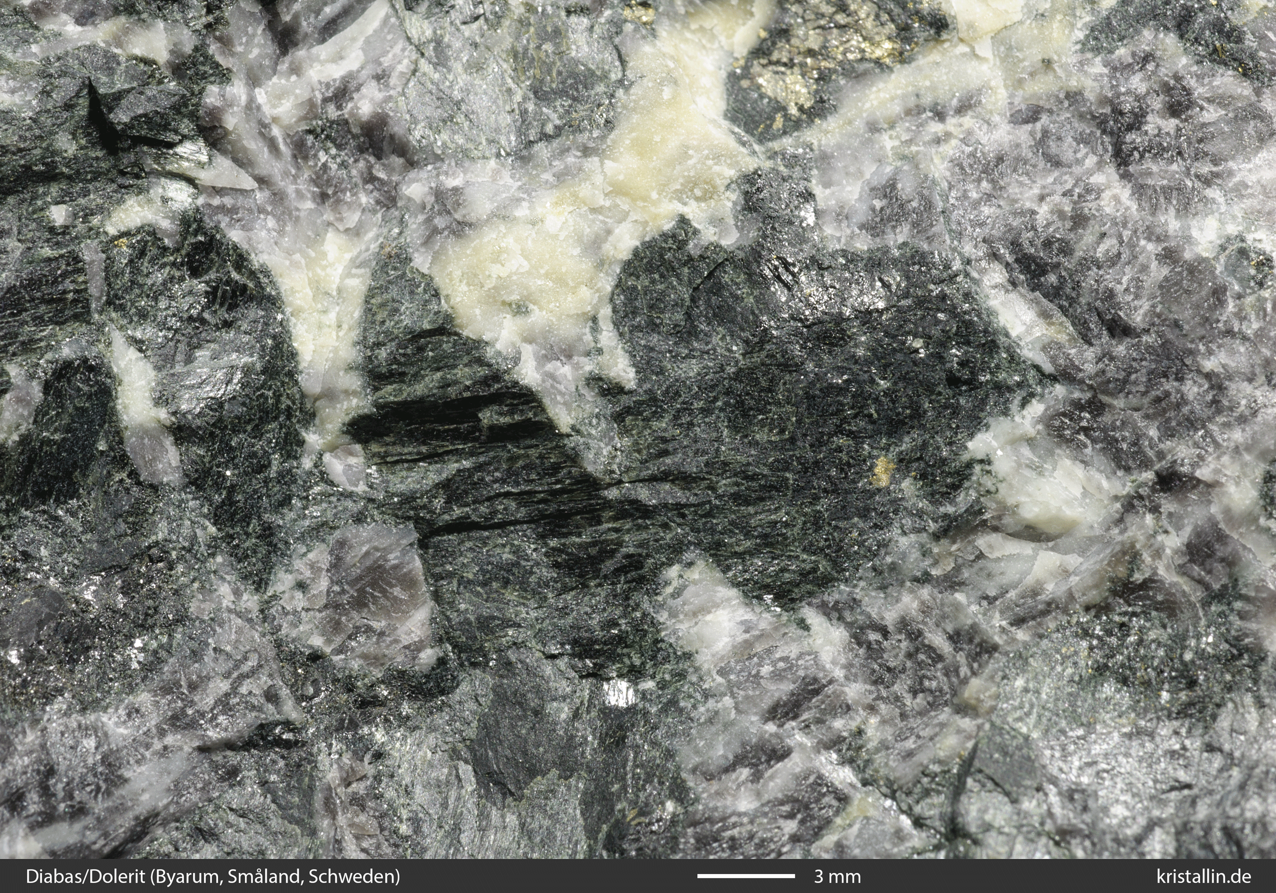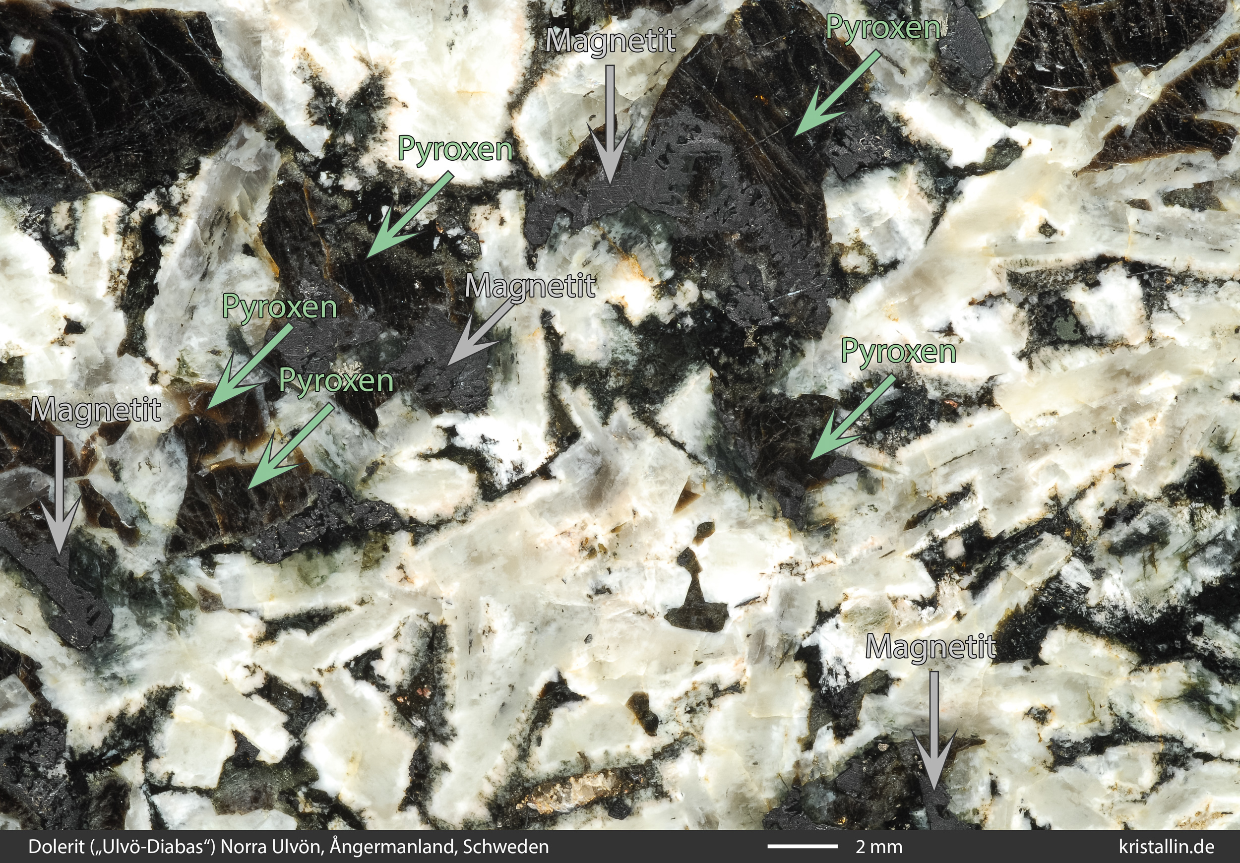 Weil man die pyroxentypischen Spaltwinkel von 90° fast nie findet, ist es besser, auf den eher matten Glanz der Pyroxene zu achten und die leistenförmigen, hellen Feldspäte als Plagioklase zu bestimmen. Enthält das Gestein dann noch Magnetit, kann man sicher sein, einen Dolerit/Diabas vor sich zu haben.