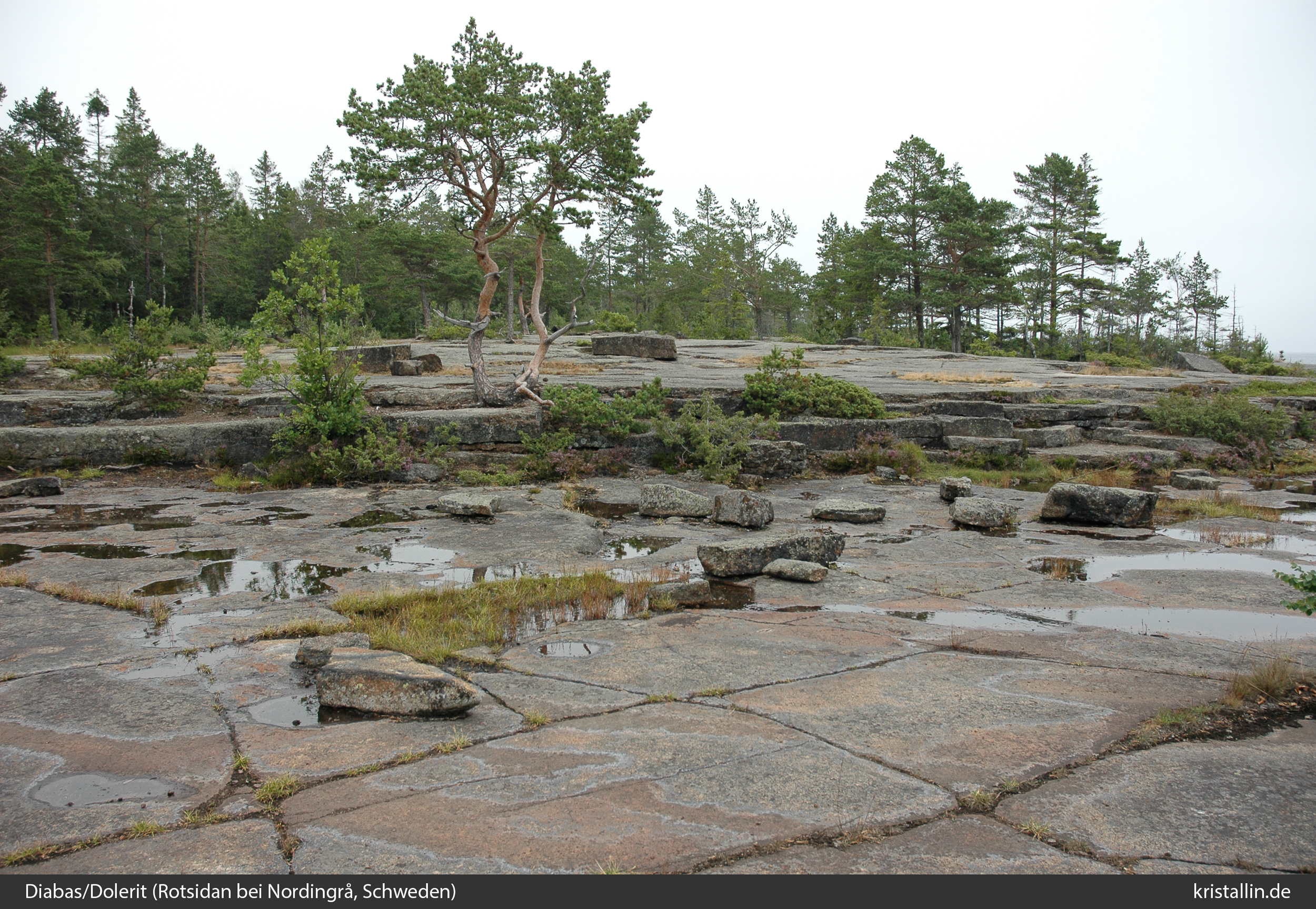 Wer in Schweden unterwegs ist, findet ein bemerkenswert großes Vorkommen bei Nordingrå. Die Küste dort heißt „Rotsidan“ und besteht auf mehreren Kilometern Länge aus einem grobkörnigen Diabas/Dolerit. Bild 11 (oben) ist eine Nahaufnahme.