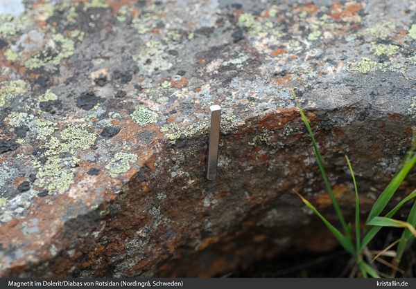 Auch dieser Diabas enthält viel Magnetit, denn ein Magnet haftet dort an jedem Felsen.