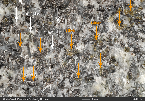 Einige Diabase/Dolerite enthalten zusätzlich Olivin. Um ihn zu erkennen, braucht man eine frische Bruchfläche, auf der Olivin wie Quarz aussieht. Er hat eine unebene Bruchfläche, Glasglanz und ist oft farblos oder durch Verwitterung gelblich. Olivin ist in diesen Gesteinen nie grün.
