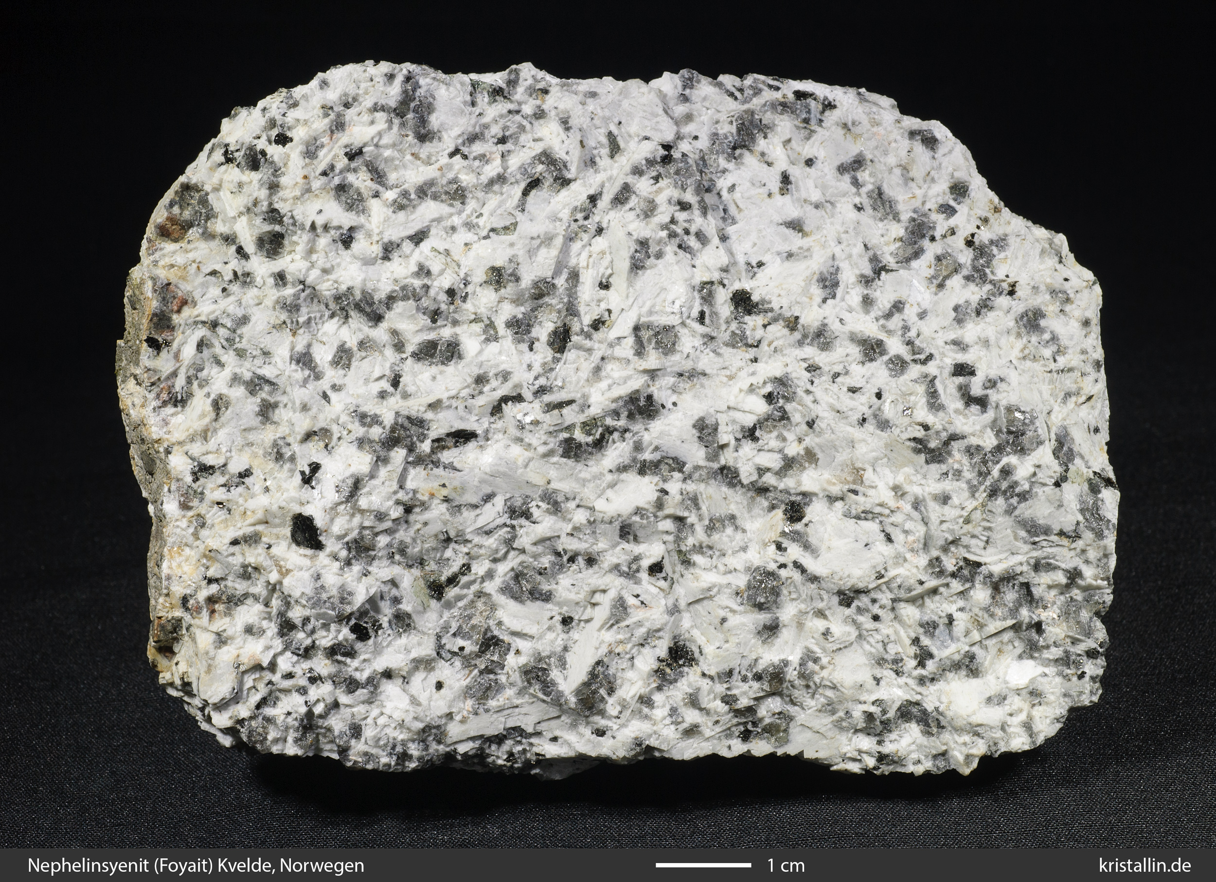 Das Bild zeigt einen frischen Foyait. Ist er angewittert, wird der Nephelin an der Oberfläche verschwunden sein. Dann ist das Gestein von kleinen Gruben übersät sein und besteht nur noch aus hellen Feldspatleisten.