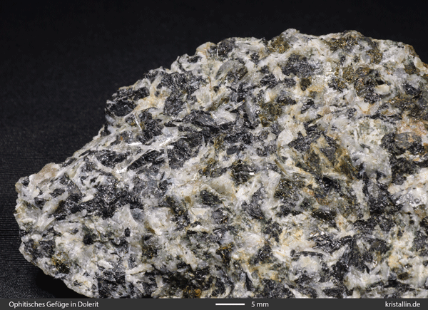 Die Größe der Pyroxene verdient einen genauen Blick. Bewegt man den Stein im Licht, spiegeln einige der schwarzen Pyroxene auf großer Fläche. So ein gleichzeitig reflektierender Pyroxen ist ein Kristall, auch wenn er aus scheinbar nicht zusammenhängenden Teilen besteht. Wenn große Pyroxene viele kleine Plagioklase in sich einschließen, bezeichnet man das als „ophitisches Gefüge“.
