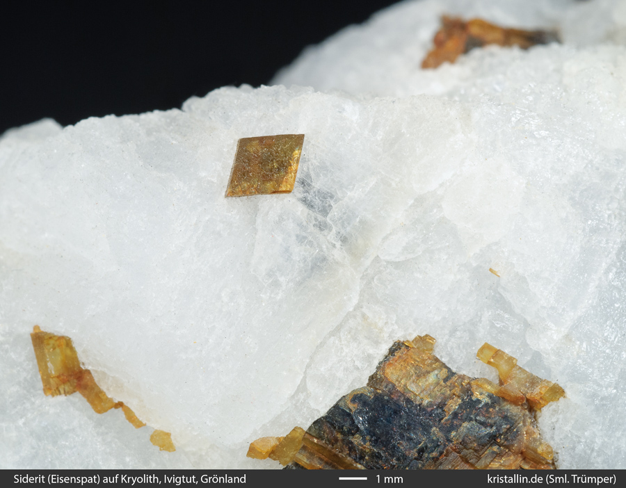 (3/6) Ein Teil des Siderits konnte ungestört kristallisieren. Sein triklines Kristallgitter lässt Rhomboeder wie hier oben entstehen. Siderit ist Eisenkarbonat: FeCO3