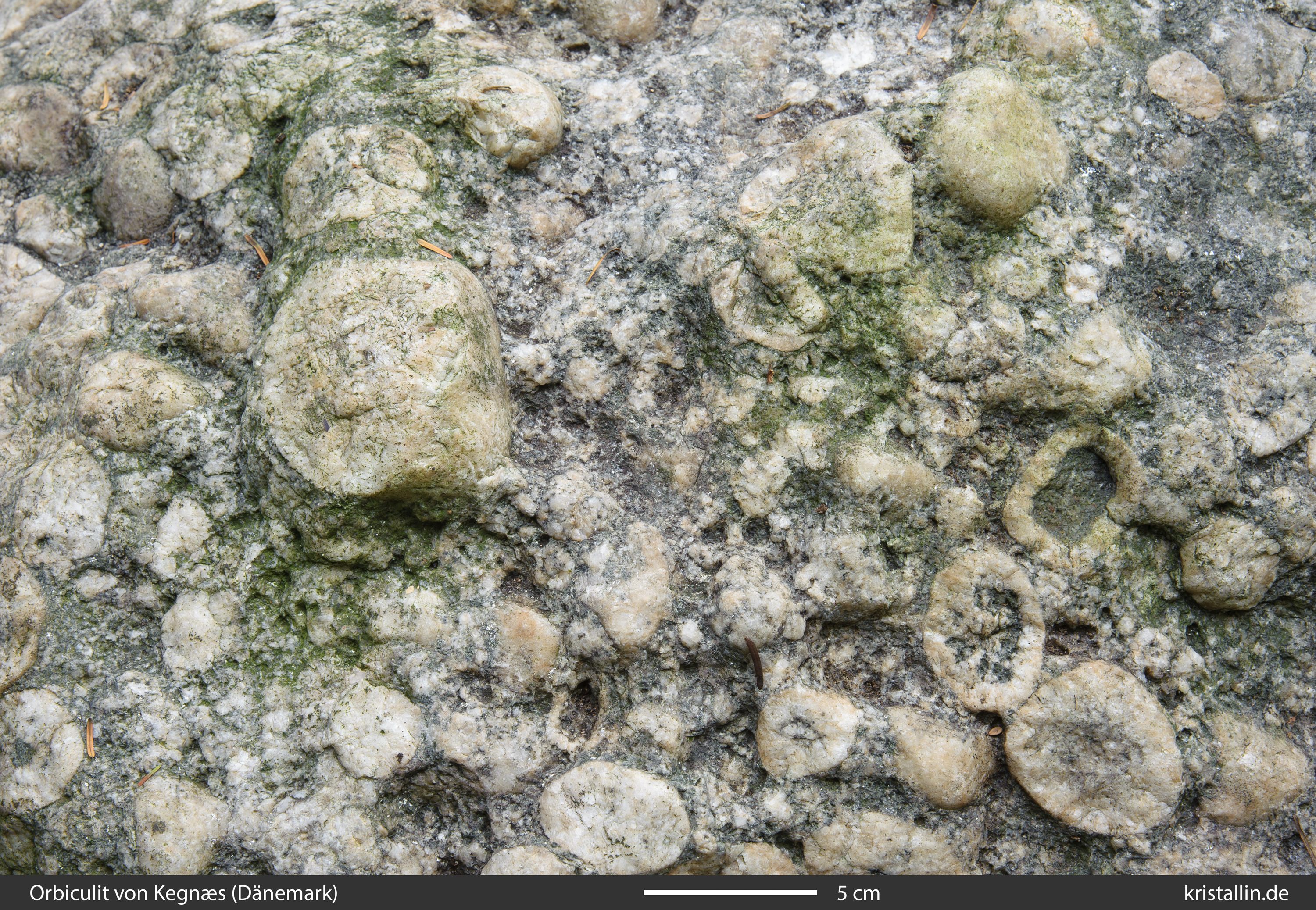 The orbicular rock is characterised by many orbicules with a size of about 5 cm. The orbicules have a single shell of plagioclase and the composition of a diorite. The ground mass, on the other hand, is quartz-rich and has the composition of a tonalite.