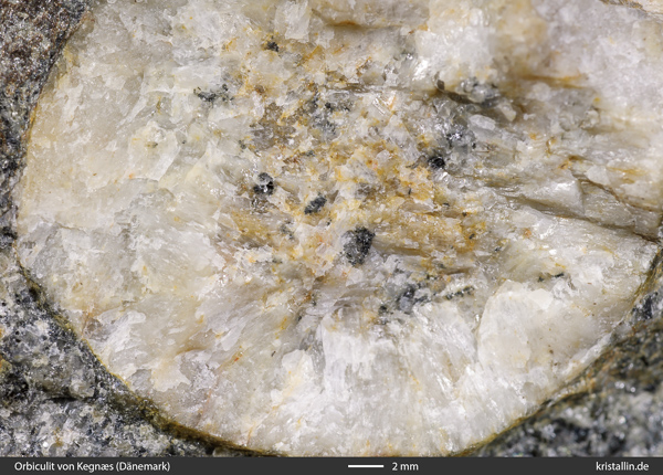 Die Kerne der meisten Orbicule enthalten ebenfalls Plagioklas sowie etwas Quarz und etwas Biotit. Die Plagioklase sind gegenüber Quarz idiomorph und meist etwa 2-5 mm groß, die Quarze sind immer kleiner als 1 mm. Der Biotit ist vermutlich etwas zersetzt, denn es gibt gelbfleckige Verfärbungen.
