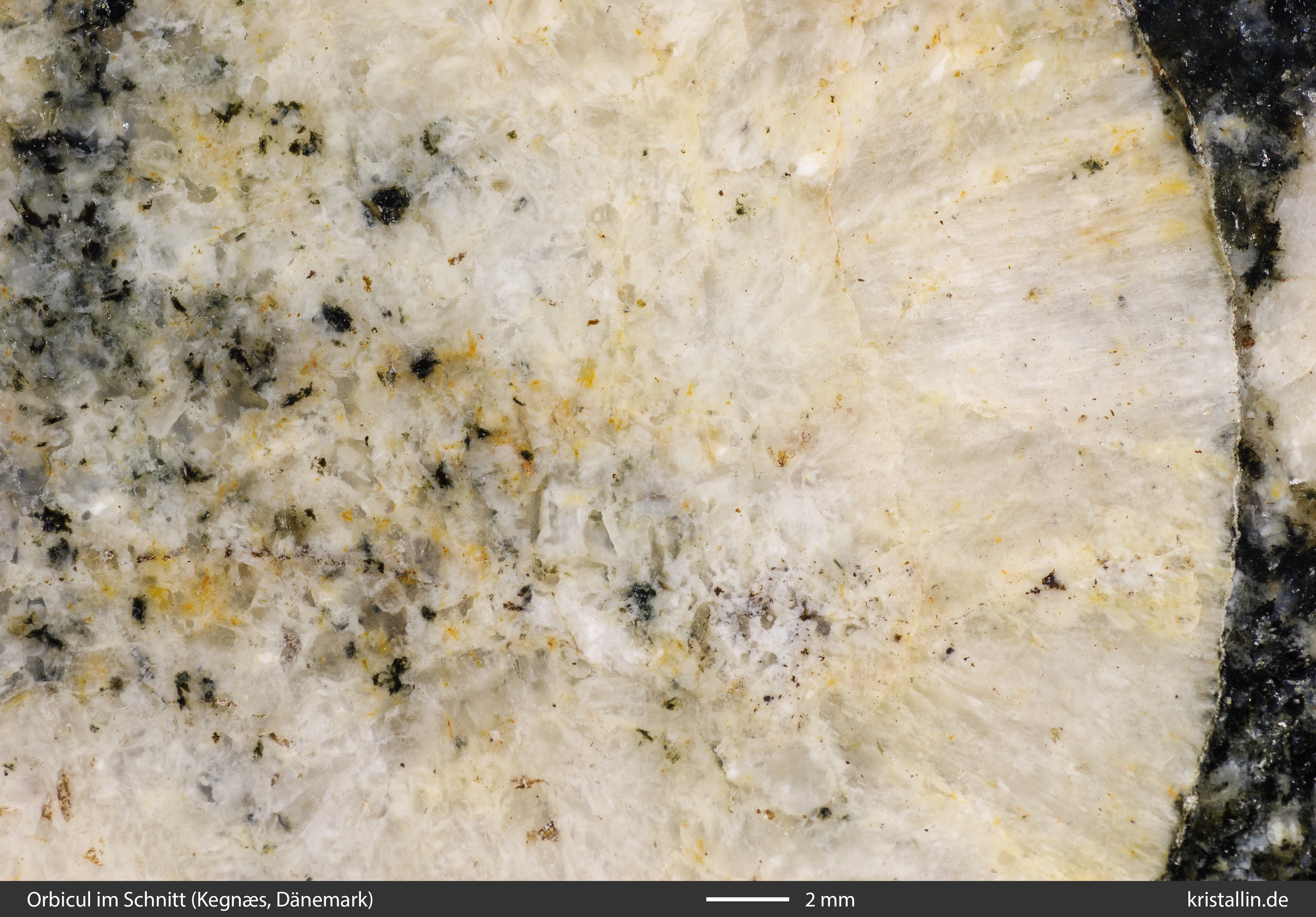 Die makroskopische Bestimmung der Orbicule ergibt eine dioritische Zusammensetzung. Da sie nur wenig Biotit enthalten, kann man das auf einen „Leuko-Diorit“ einengen. Dem liegt die Annahme zugrunde, dass der Anorthitgehalt des Plagioklas’ niedrig ist. Der Mangel an dunklen Mineralen stützt diese Vermutung (Vinx 2015, S. 187).