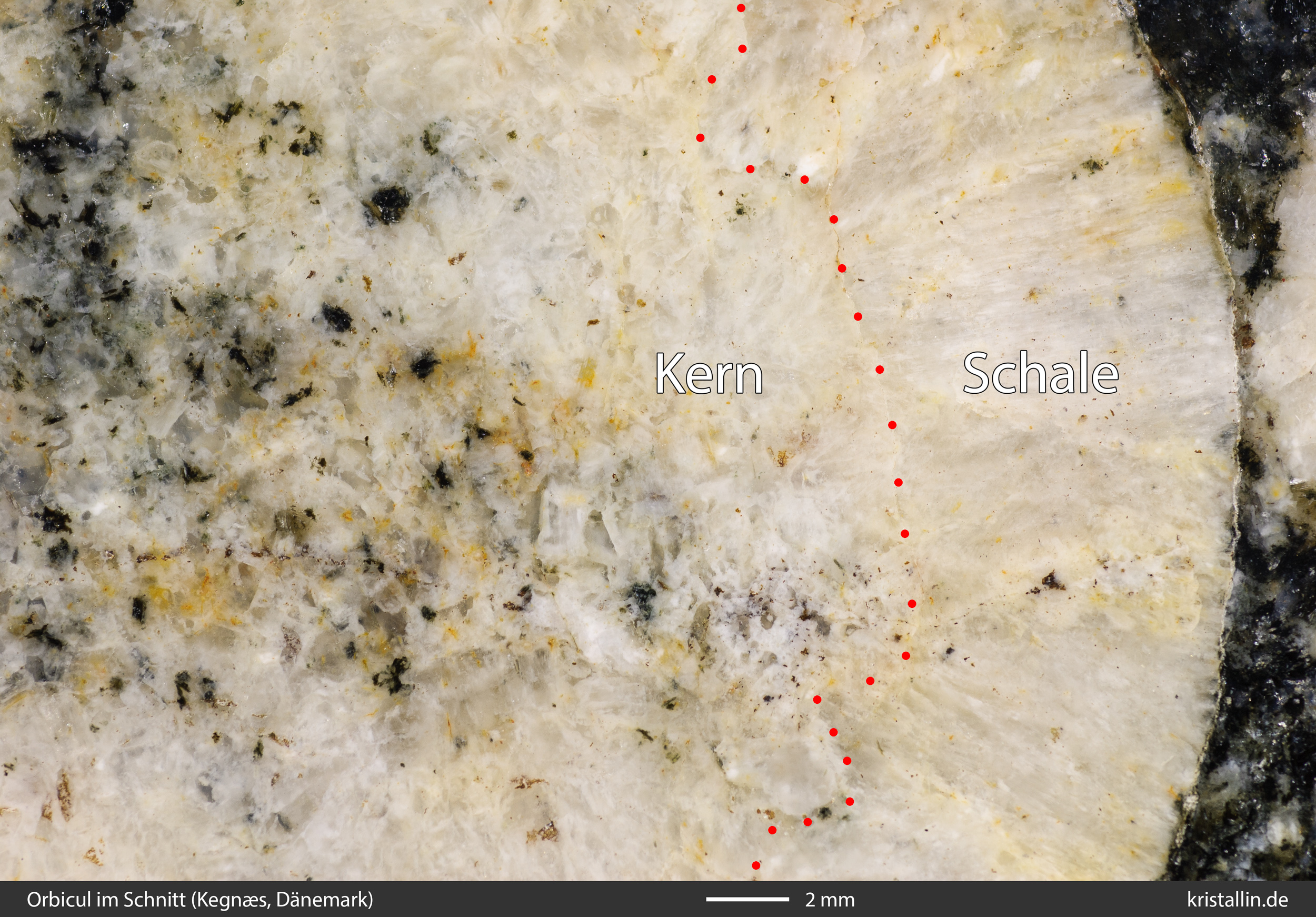 Die Orbicule sind einschalig. Alle Kerne sind, unabhängig von ihrer Größe, von nur einer Schale aus weißem Plagioklas umgeben. Diese Schalen sind zwischen 5 und 10 mm dick und bestehen aus vielen Einzelkristallen, die meist radial nach außen gewachsen sind. Ein Teil dieser Plagioklaskristalle ist so lang, wie die Schale dick ist.