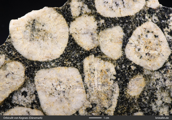 Die Zusammensetzung der Orbiculite ist überaus vielfältig, denn man hat sie in praktisch allen magmatischen Gesteinen gefunden. Dabei ist die Größe der Orbicule mit dem SiO2 -Gehalt verknüpft. Steigt sein Anteil, werden die Orbicule größer. In ultramafischen Peridotiten oder in einem Karbonatit sind die Orbicule nur klein.