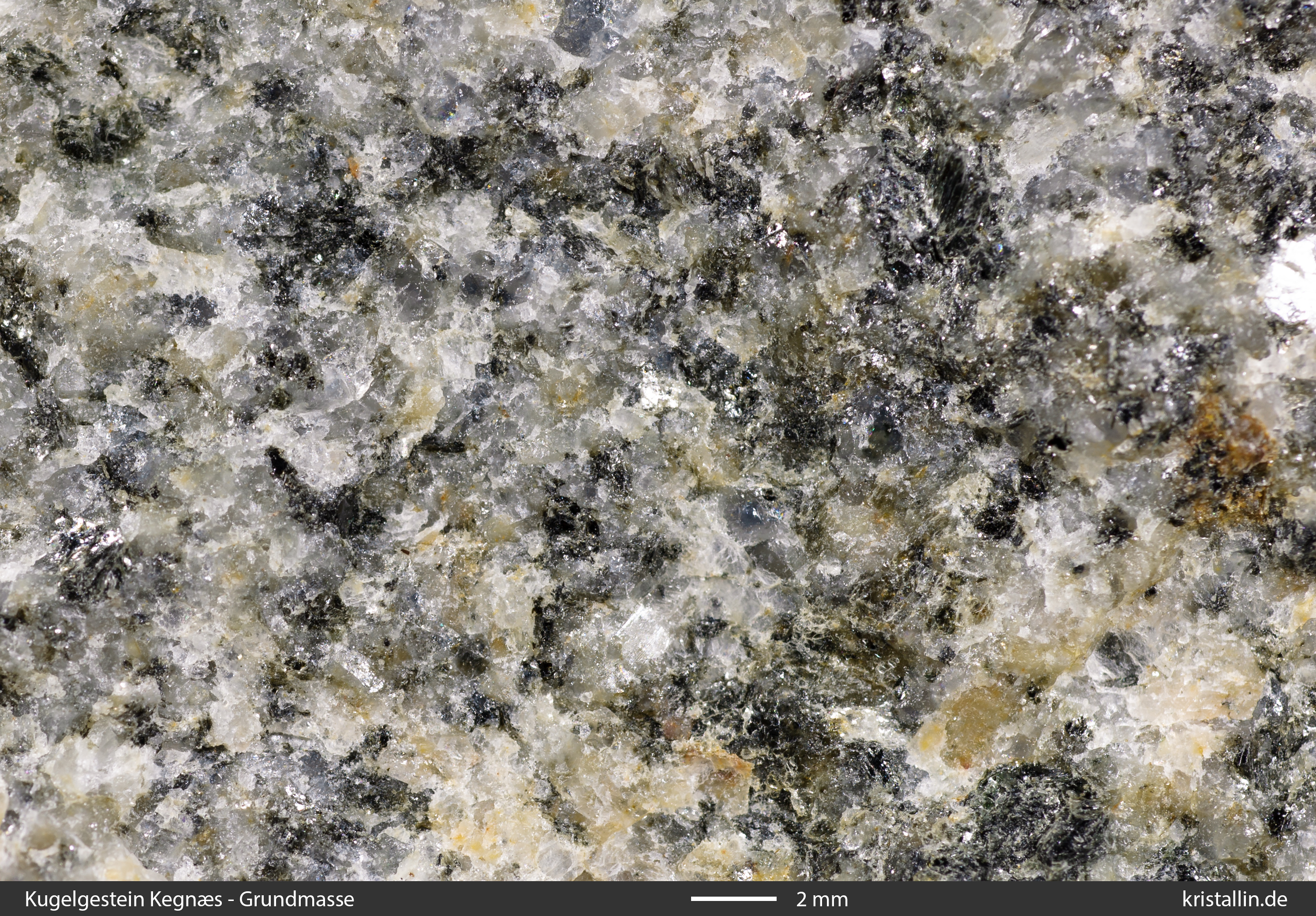 Gleichzeitig ist die Grundmasse inhomogen. In den feinkörnigen Anteilen sind alle Minerale kleiner als 2 mm, während an anderer Stelle die Grundmasse grobkörnig ist und Plagioklase von über 1 cm Größe enthält.