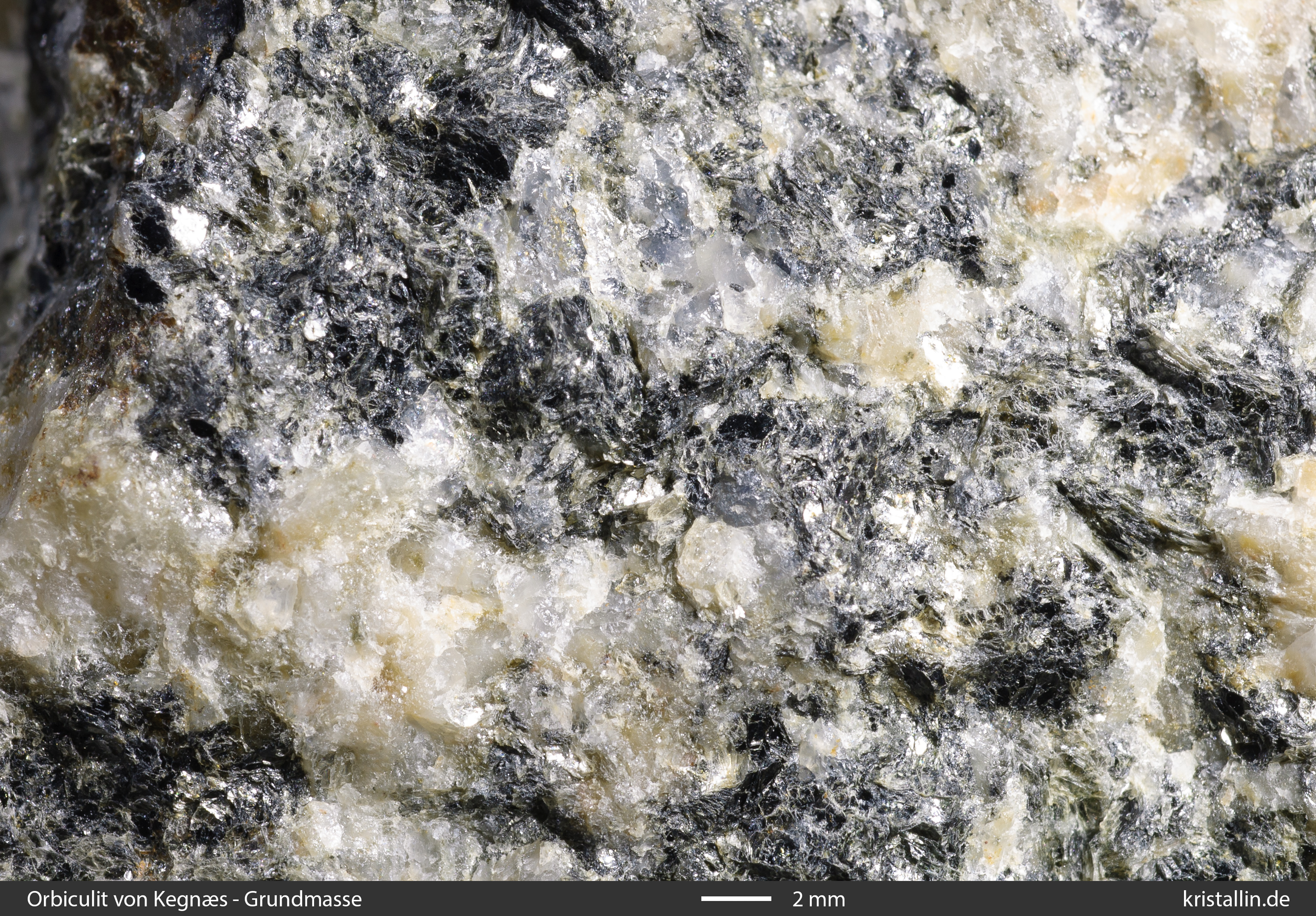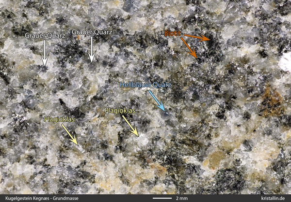 Die Grundmasse zwischen den Orbiculen besteht aus Plagioklas, Quarz und Biotit, wobei der Quarz mehr als 50 % des Volumens ausmachen kann, was die Zusammensetzung eines Tonalits ergibt.