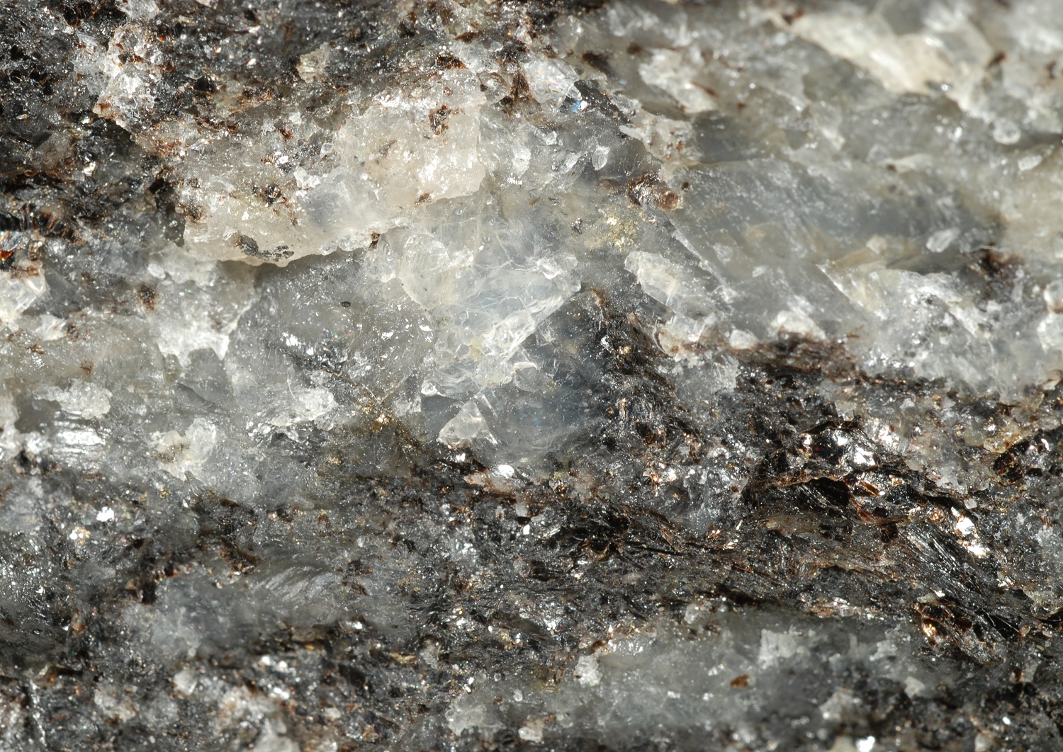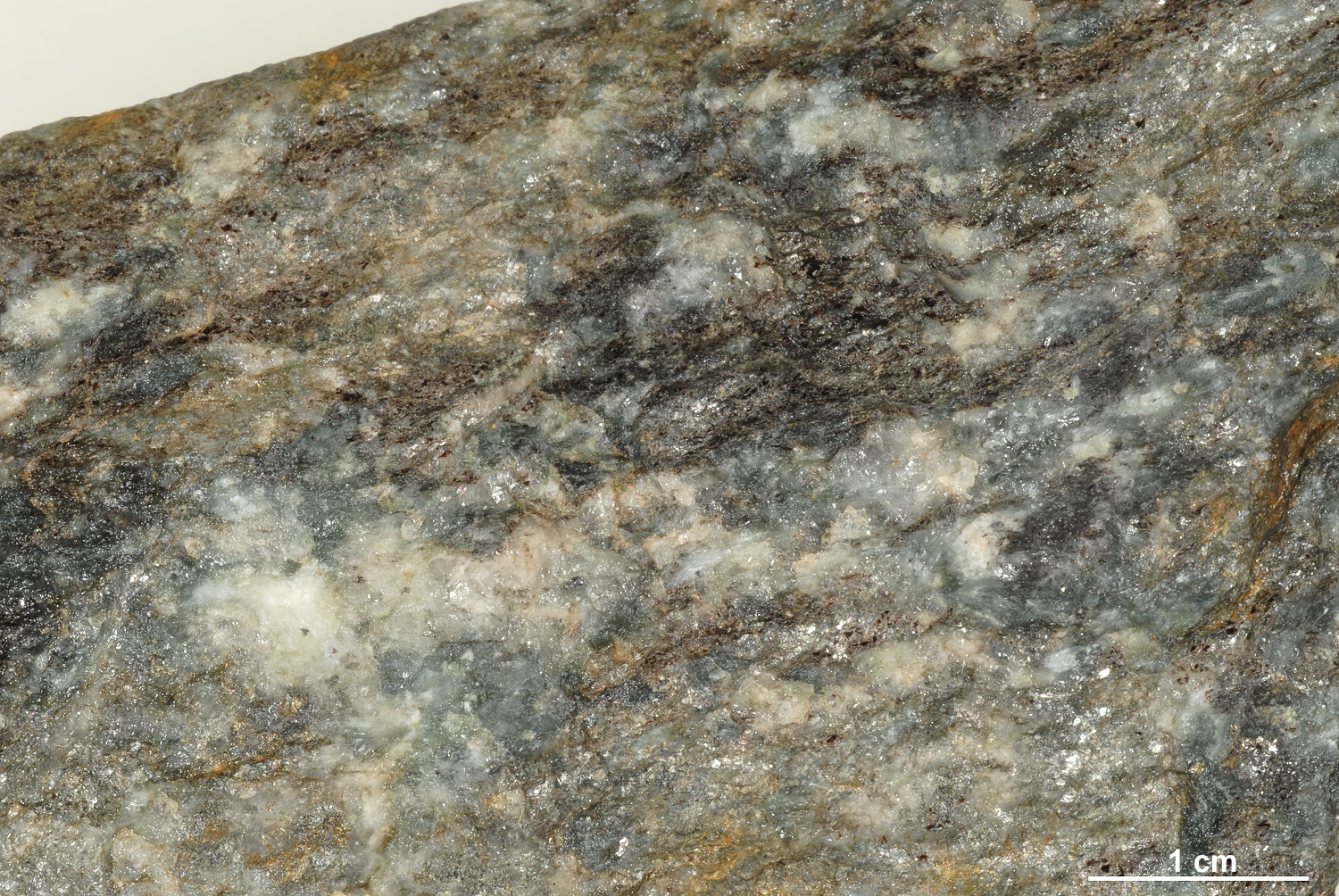 Das blaugraue, unscharf begrenzte Mineral in diesem Gneis ist Cordierit.