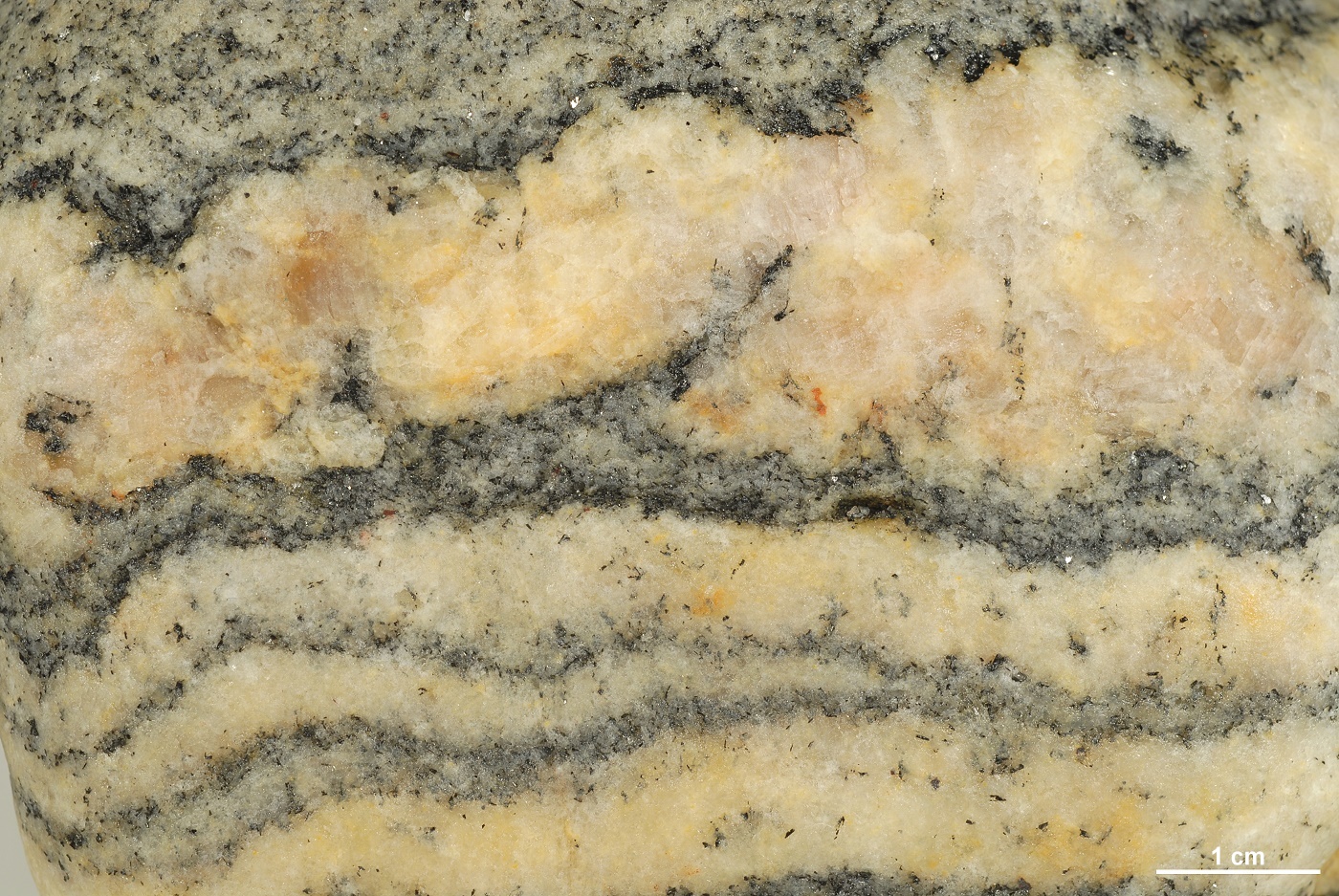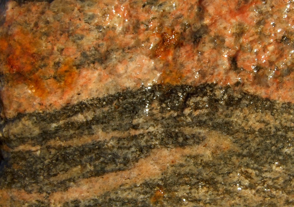 Die hellen Lagen sind Quarz-Feldspat-Gemische, die sich von den dunklen