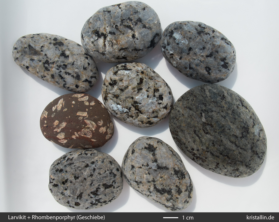 (1/57) Diese Larvikitgeschiebe stammen zum größten Teil aus Norddänemark, wo es so einfach ist, welche zu finden, dass man es auch „unsportlich“ nennen könnte. Der eine Rhombenporphyr soll die enge Verwandtschaft der beiden Gesteine betonen. Dass die ehemalige Lava eine ganz andere Farbe als der Larvikit hat, liegt an den chemischen Veränderungen, denen die Lava unterworfen ist (Alteration).