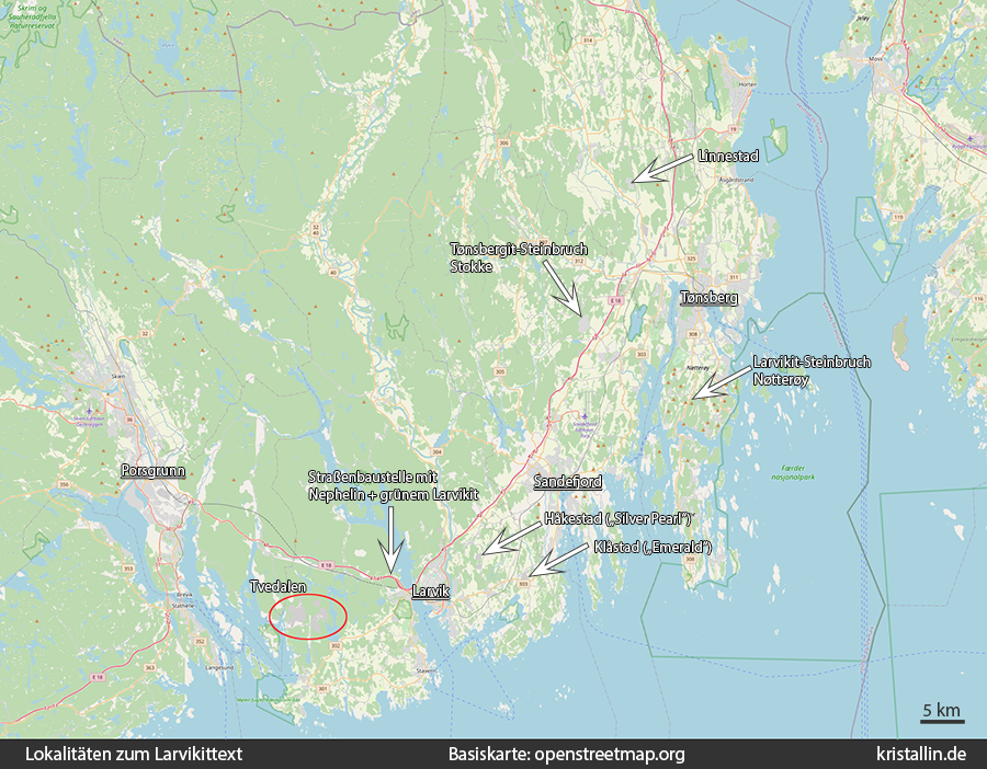 Diese Karte enthält einige der genannten Aufschlüsse. Aus dieser Fläche hier stammen die meisten Geschiebe – jedoch nicht alle, denn weiter nördlich gibt es weitere kleine Larvikitvorkommen.