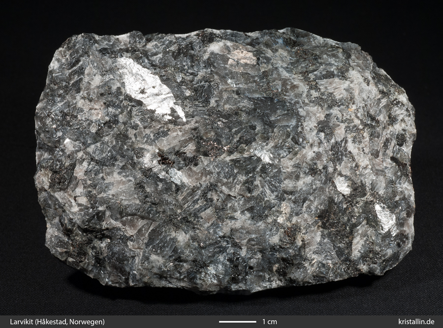 (7/57) Grobkörniger Larvikit aus Håkestad in Südnorwegen. Der rhombenförmige Feldspat ist fast zwei Zentimeter lang.