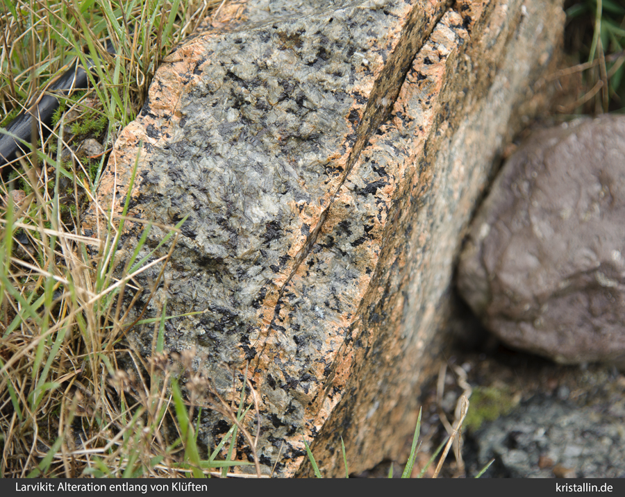 (15/57) Dieses Stück lag am Rand des Steinbruchs bei Stålaker. Die Verfärbung durch Alteration beschränkt sich auf einen schmalen Saum beiderseits der Risse, an denen der Stein auch zerbrochen ist.