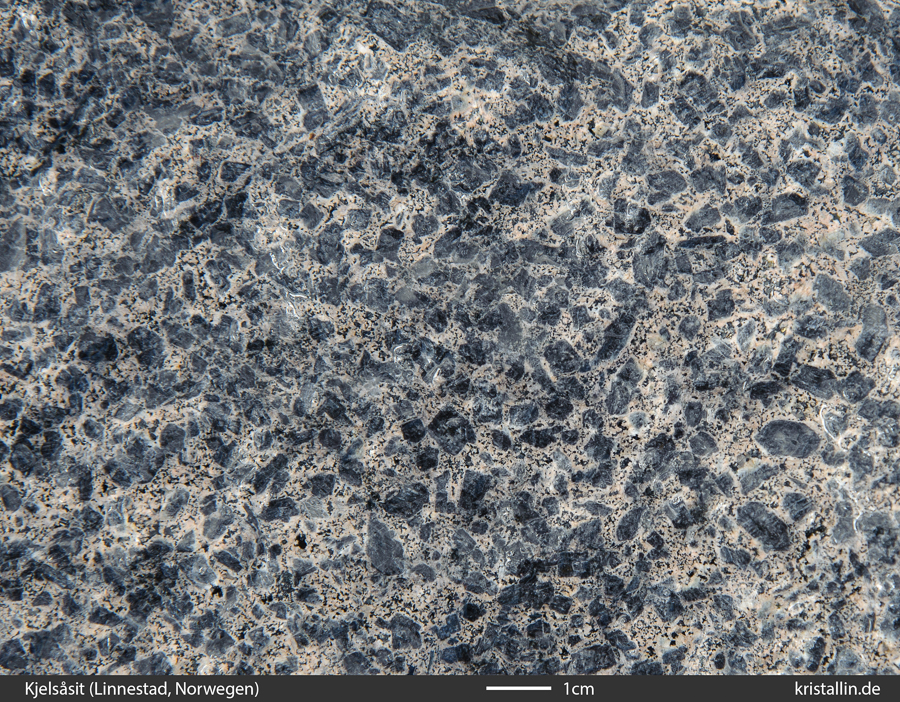 (23/57) Kjelsåsit ist nichts anderes als ein etwas kalziumreicherer Larvikit. Das hier ist nur eine von diversen Varianten, in denen das Gestein vorkommt. Für die Bestimmung von Hand ist das ein porphyrischer Larvikit, denn man kann Kjelsåsit ohne Labor überhaupt nicht von Larvikit unterscheiden.