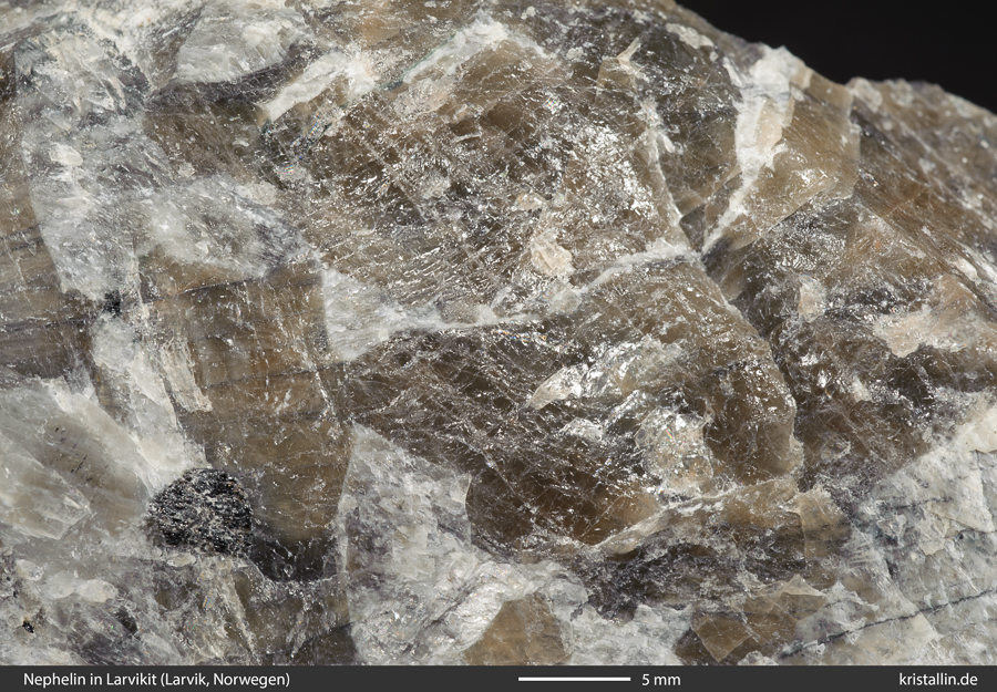 (32/57) Alles das Braune hier ist Nephelin. Dieser Feldspatvertreter kommt im westlichen Gebiet vor, allerdings nur selten in solcher Menge wie hier. Typisch für Nephelin ist Fettglanz, den man hier gut sieht. Bei flüchtiger Betrachtung kann man Nephelin mit Quarz verwechseln, was dann leider die Bestimmung auf eine komplett falsche Spur bringt. Nephelin ist säureempfindlich, was man selbst testen kann.