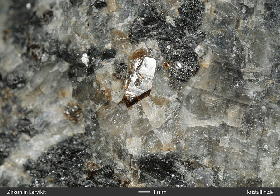 (34/57) Im Larvikit gibt es Zirkone, weshalb er ursprünglich als „Zirkonsyenit“ bezeichnet wurde. Die meisten dieser Zirkone sind viel kleiner als dieser hier und man muss aufpassen, sie nicht mit Titanit zu verwechseln, den es auch im Larvikit gibt und der die gleiche Farbe hat. Man muss die Form der Kristalle beachten - siehe dazu den Beschreibungstext. (Einzelbild)