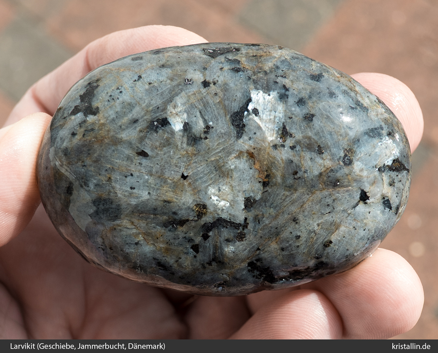 (37/57) Perfektes Larvikitgeschiebe mit schönem Schiller, nass aufgenommen. So schöne Larvikitgeschiebe sind selten.