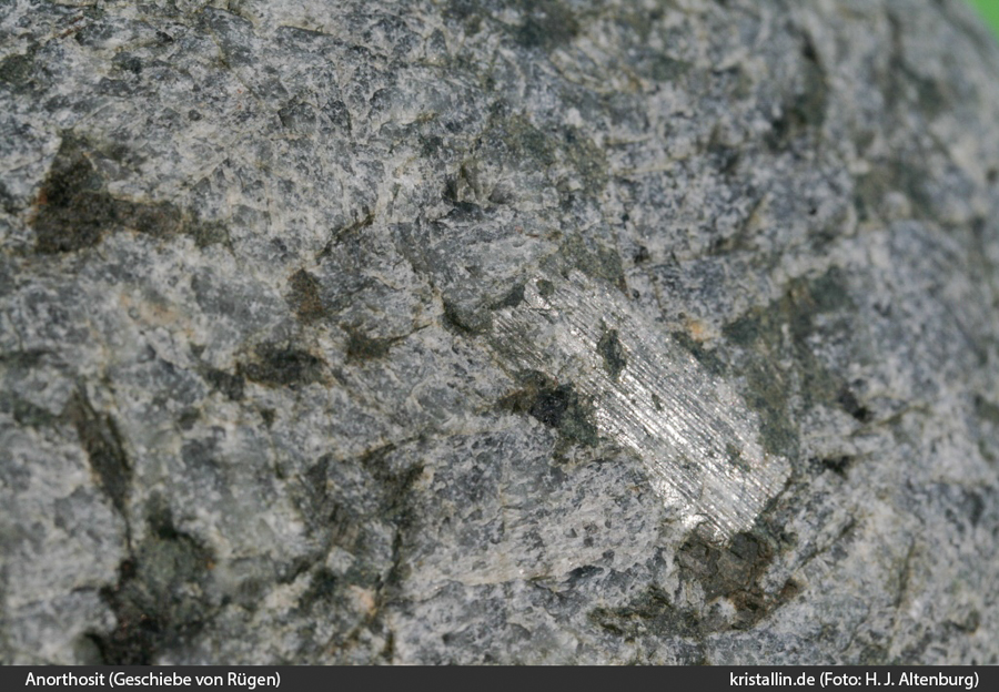 (46/57) Dieser eine spiegelnde Feldspat entscheidet. Das sind typische Plagioklaszwillinge. Eng und streng parallel und vor allem nur auf einer spiegelnden Spaltfläche zu sehen. Wenn das hier Plagioklas ist, ist es kein ternärer Feldspat und das Gestein ist Anorthosit.