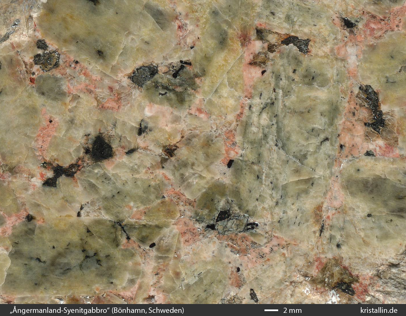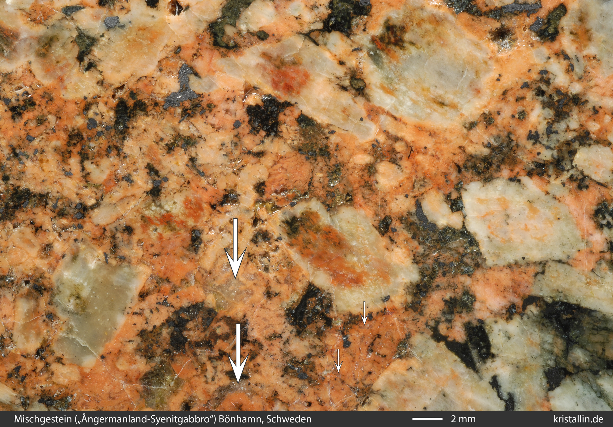 Der etwas seltsame Name „Ångermanland-Syenitgabbro“ war der Versuch des 19. Jahrhunderts, diese Mischung zu beschreiben und ist natürlich ein Widerspruch in sich. Syenite sind helle, quarzfreie Gesteine mit viel Alkalifeldspat, während Gabbros dunkel aussehen und von Pyroxen und Plagioklas dominiert werden. Beide sind komplett verschieden und gehören zu ganz verschiedenen Gesteinsgruppen.